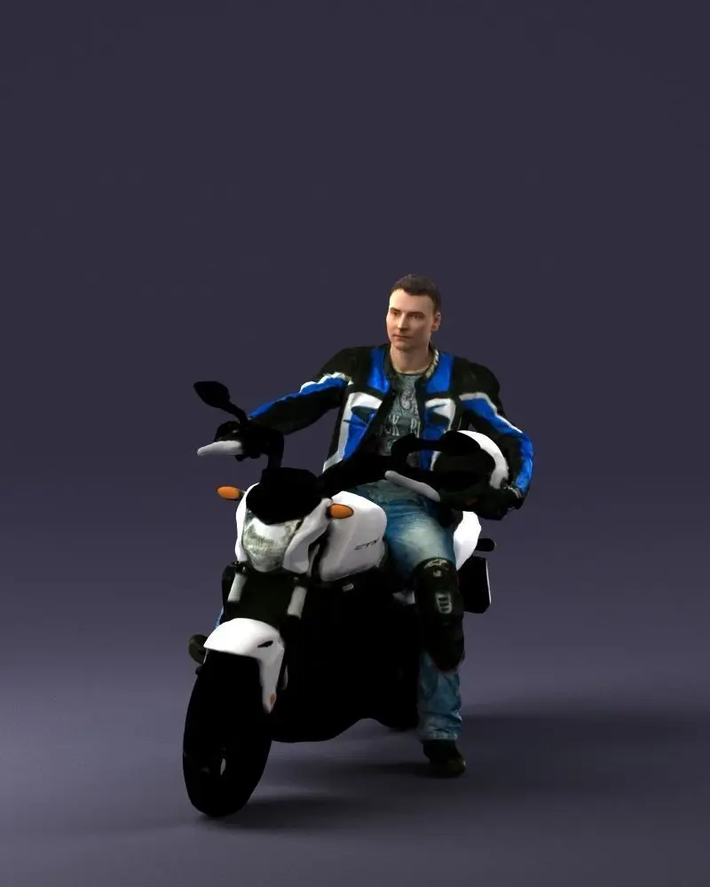 This 3D model showcases a man riding a modern motorcycle, dressed in protective gear, including a stylish blue and black jacket, jeans, and knee guards. The realistic design and dynamic pose highlight an active and adventurous theme, making it a great asset for projects related to transportation, adventure, or urban lifestyle.