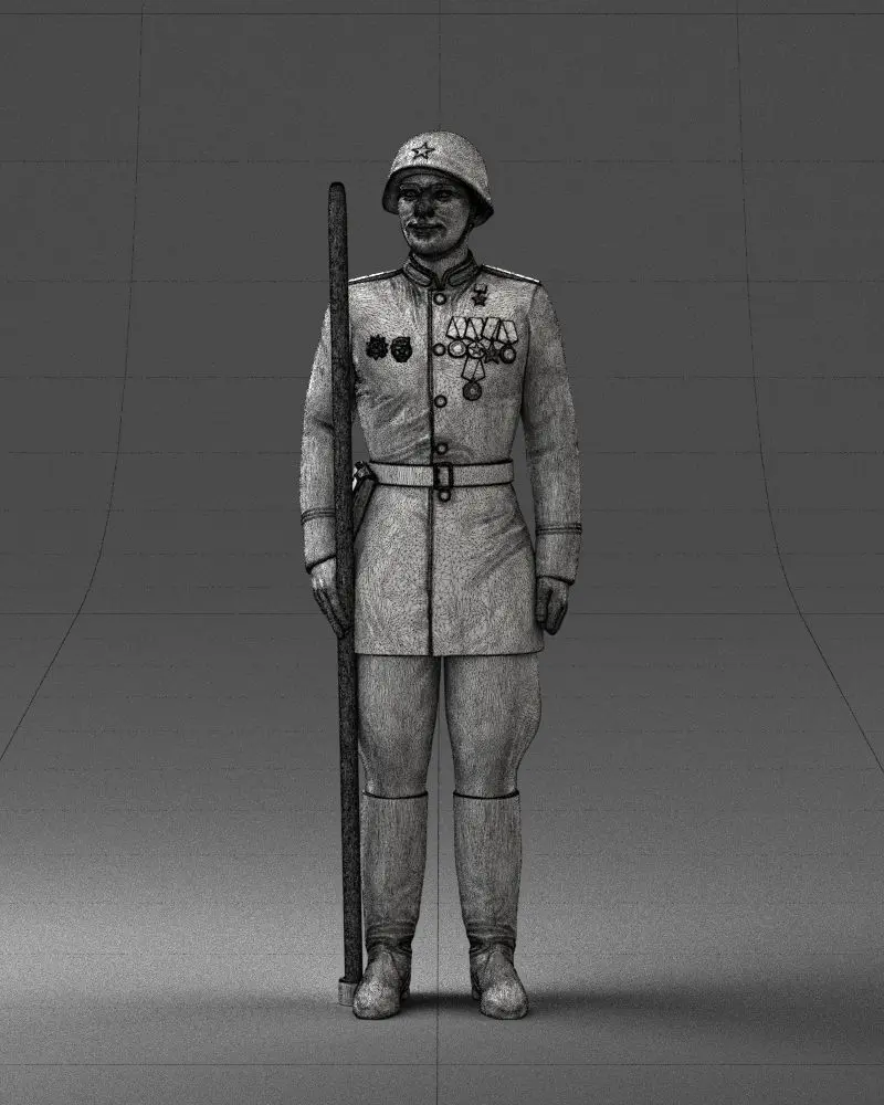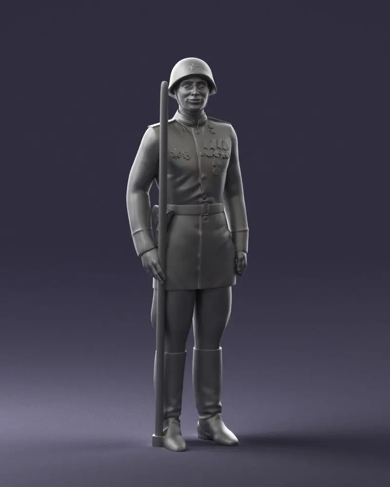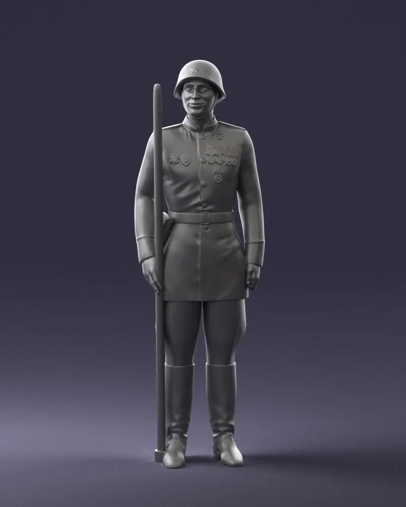 A detailed 3D-printable miniature of a smiling Soviet soldier, wearing a decorated uniform and helmet. Designed using 3D scanning technology, this model is ideal for collectors, wargaming, or historical diorama creators who appreciate personality in their figures.