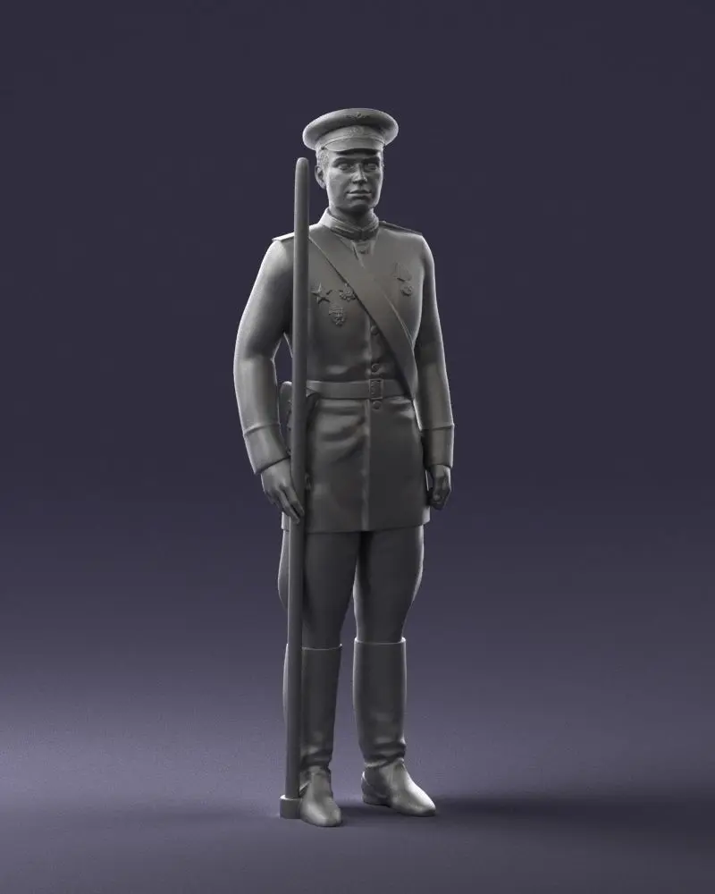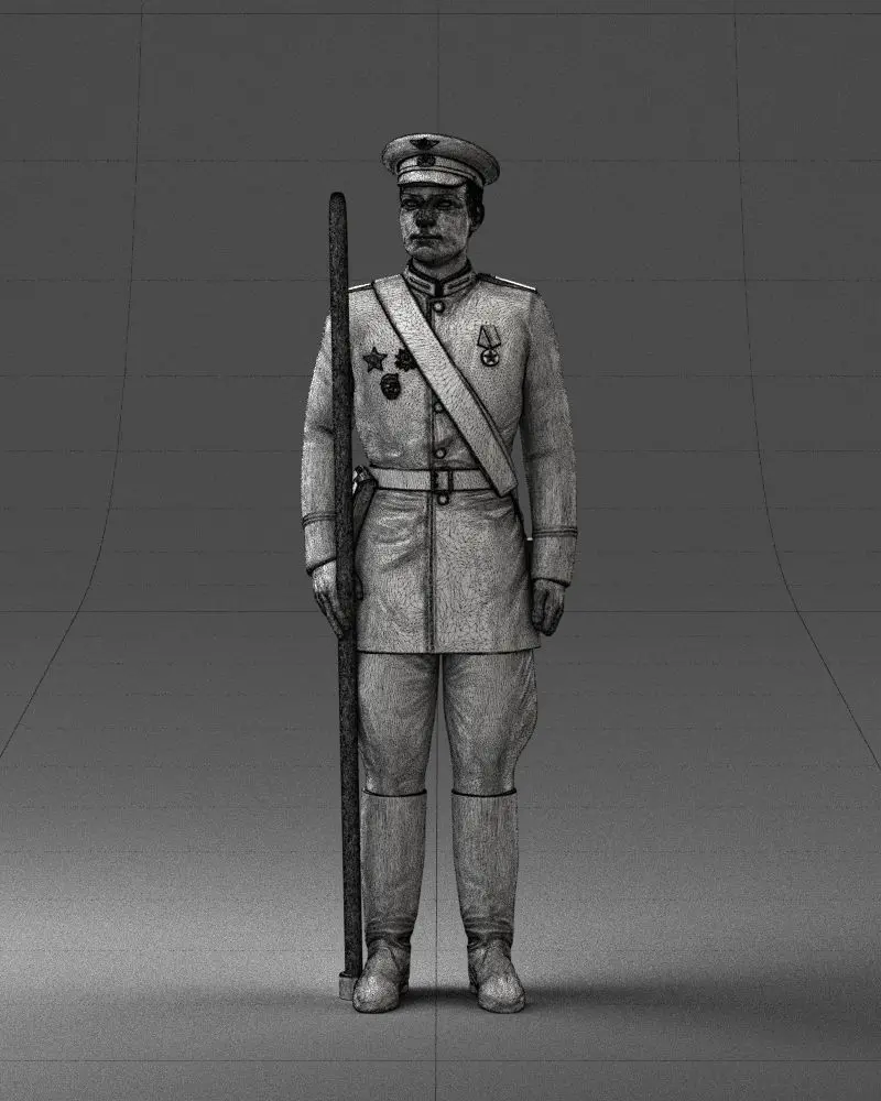Highly detailed 3D model of a Soviet soldier in a decorated parade uniform, standing upright with a rifle. Created using 3D scanning technology, this asset is ideal for creative or professional projects requiring realistic human characters, such as games, historical reconstructions, or animations.