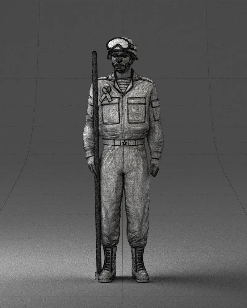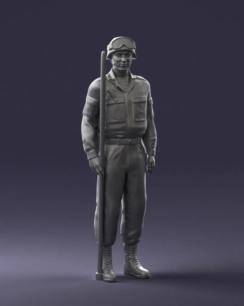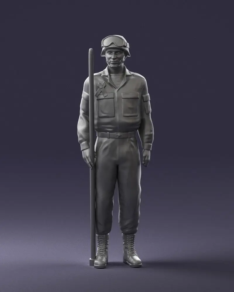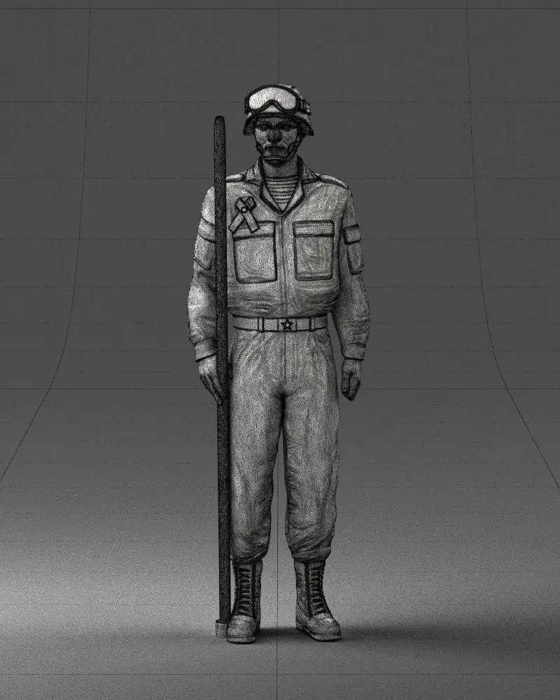 Detailed 3D model of a Soviet tank crew member in modern uniform and protective goggles. Created using 3D scanning technology, this asset is perfect for creative or professional projects requiring realistic human characters in military settings, especially those involving mechanized units or historical war themes.