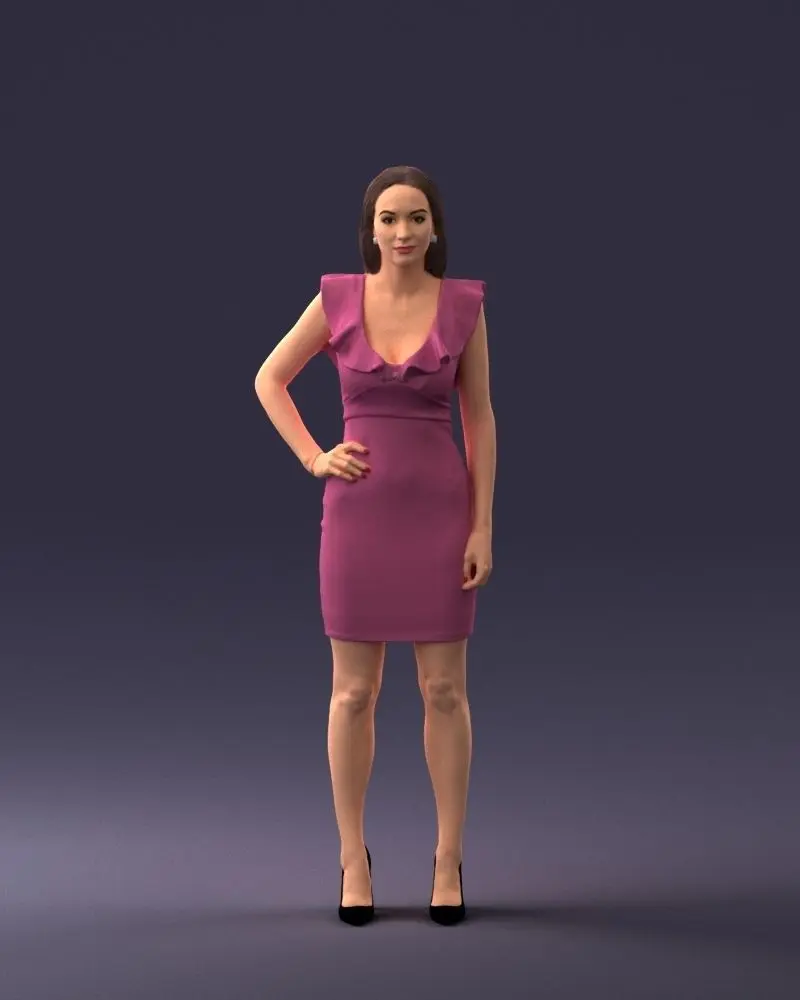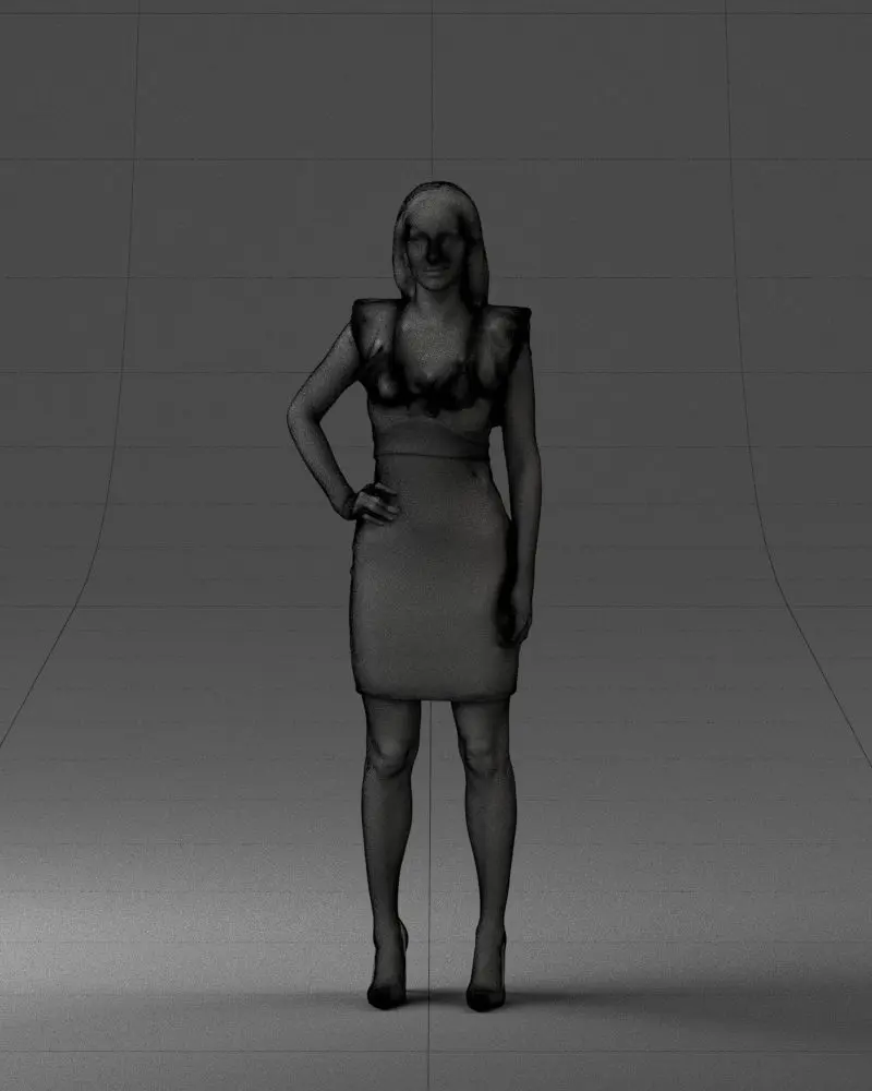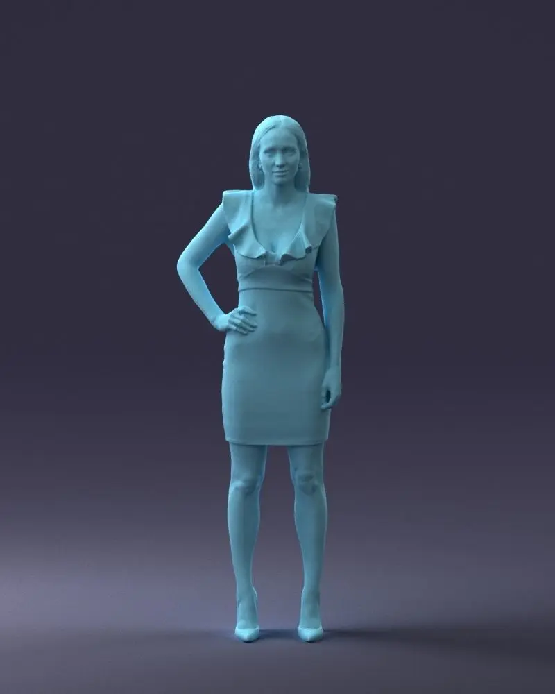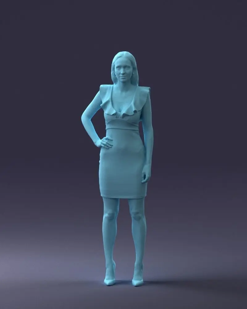 High-quality 3D printable female model wearing a modern fitted dress with detailed ruffles. Captured with precise 3D scanning technology, this standing figure is optimized for resin or FDM printing. Suitable for artistic display, character collection, or fashion design visualization.
