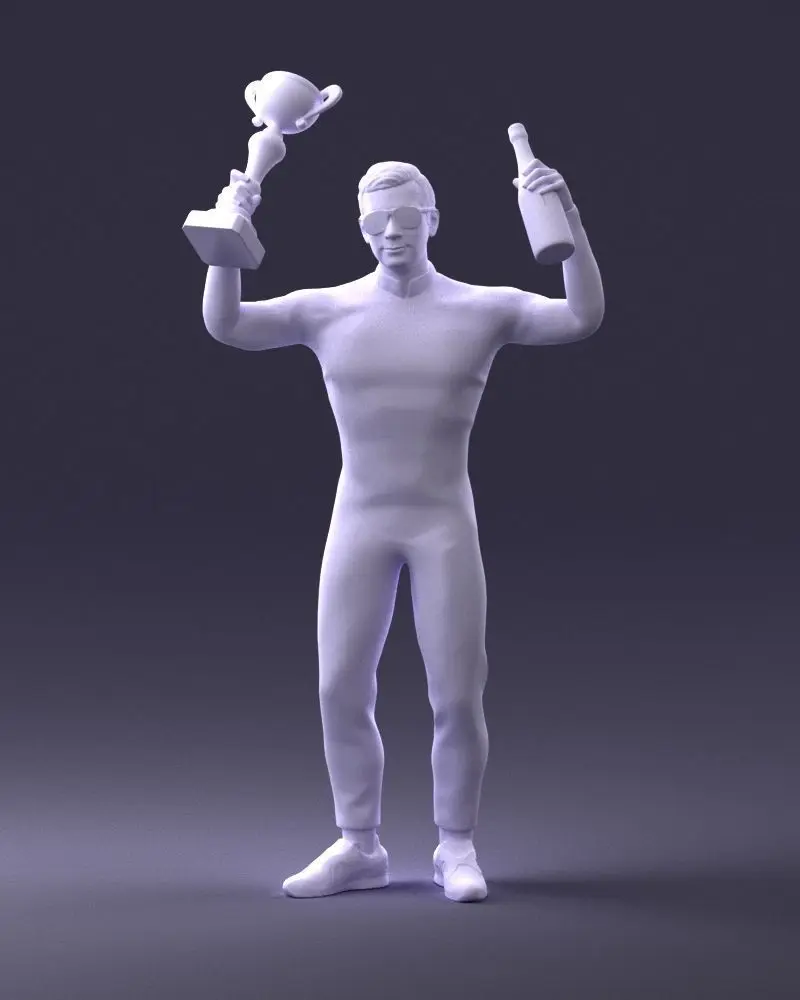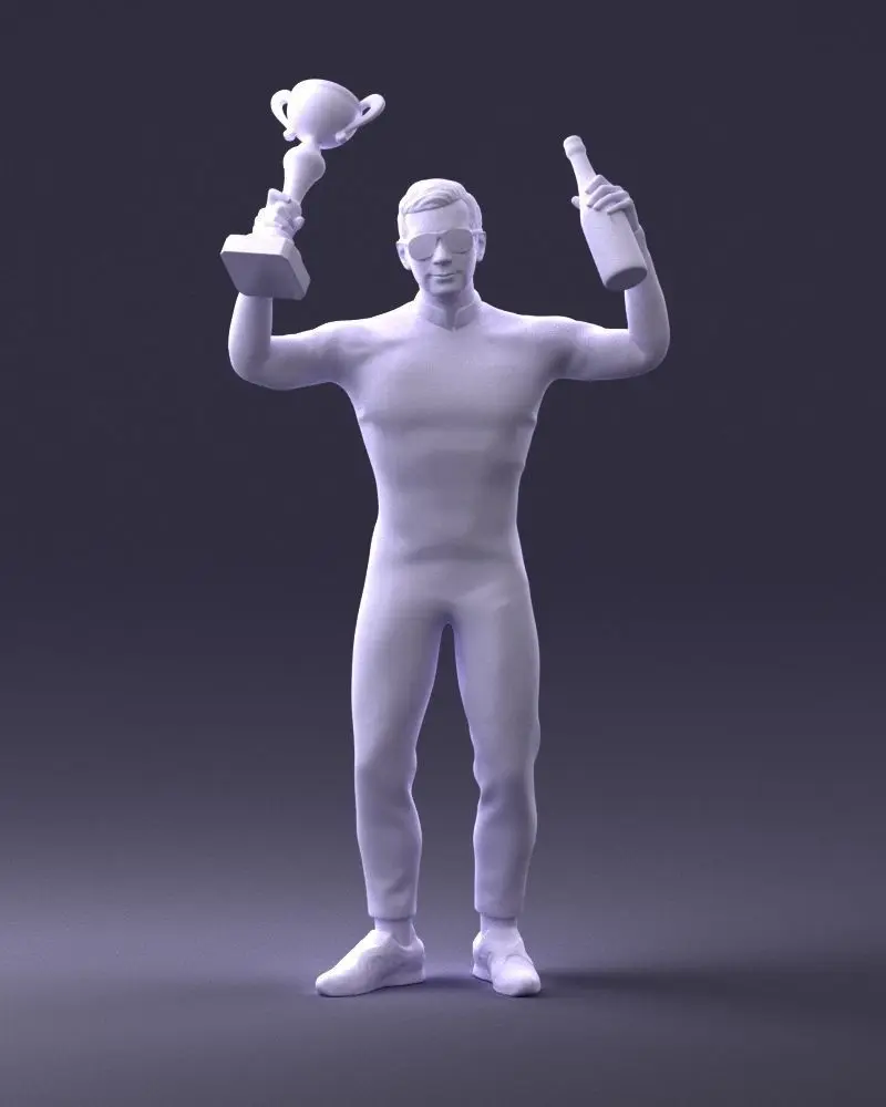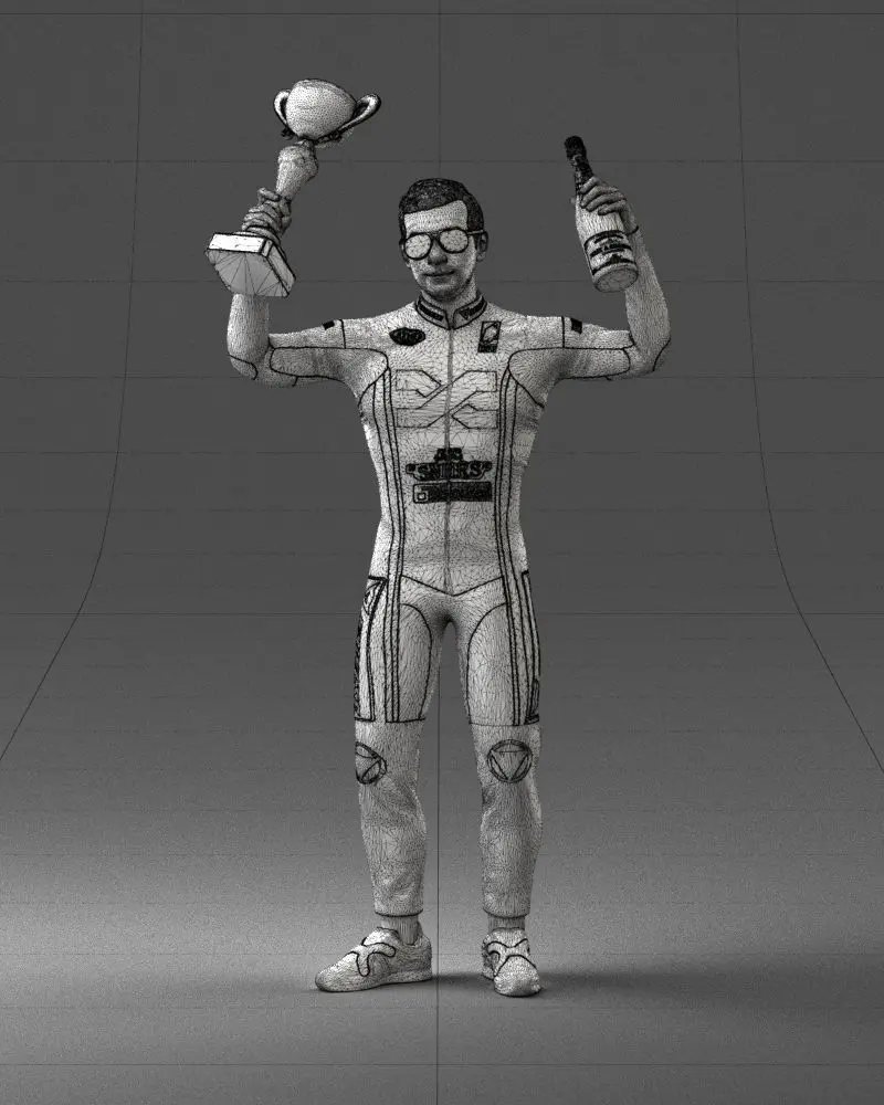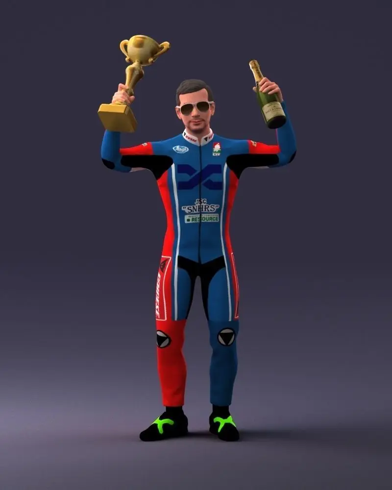3D Model: Racing Champion – Victory Pose with Trophy and Champagne This stylized 3D model represents a victorious race car driver celebrating on the podium, dressed in a vibrant professional racing suit, holding a golden trophy in one hand and a champagne bottle in the other. The model captures a dynamic and festive pose, ideal for visual storytelling in sports games, cinematic scenes, or promotional materials. Designed with clean topology and detailed textures, it’s ready for use in creative or professional projects requiring realistic human characters.