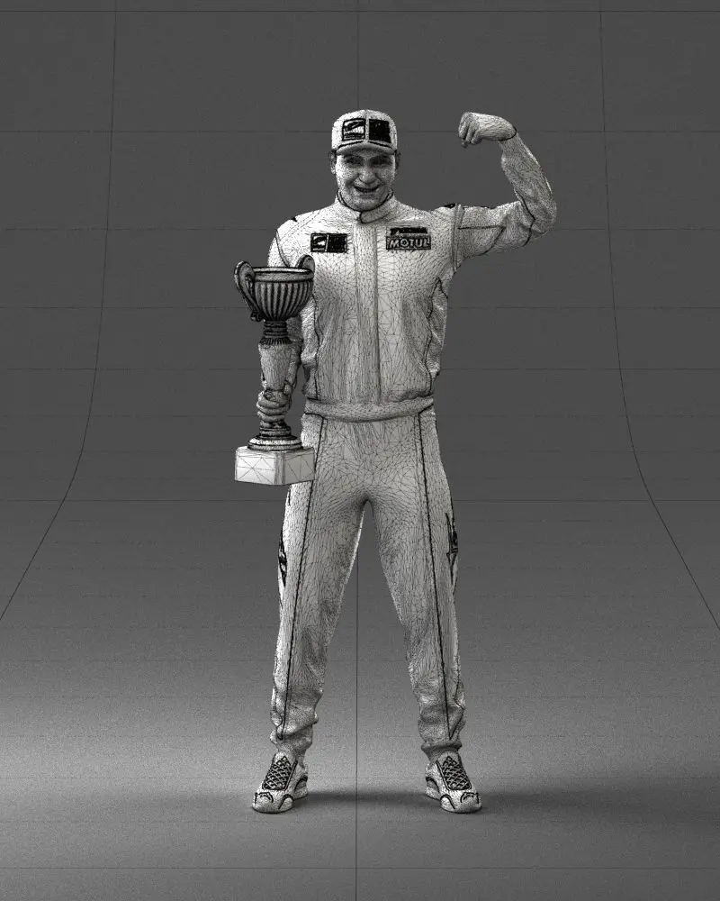 Capture the thrill of victory with this printable 3D figurine of a racing champion proudly holding his trophy. Wearing a full racing suit and helmet cap, the confident pose and detailed attire make this model perfect for fans of motorsport and collectors alike.