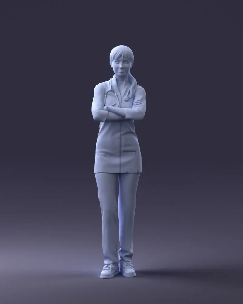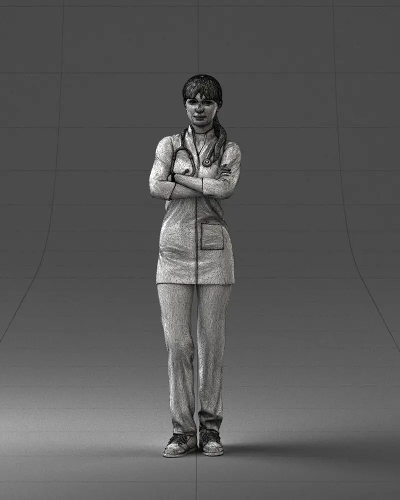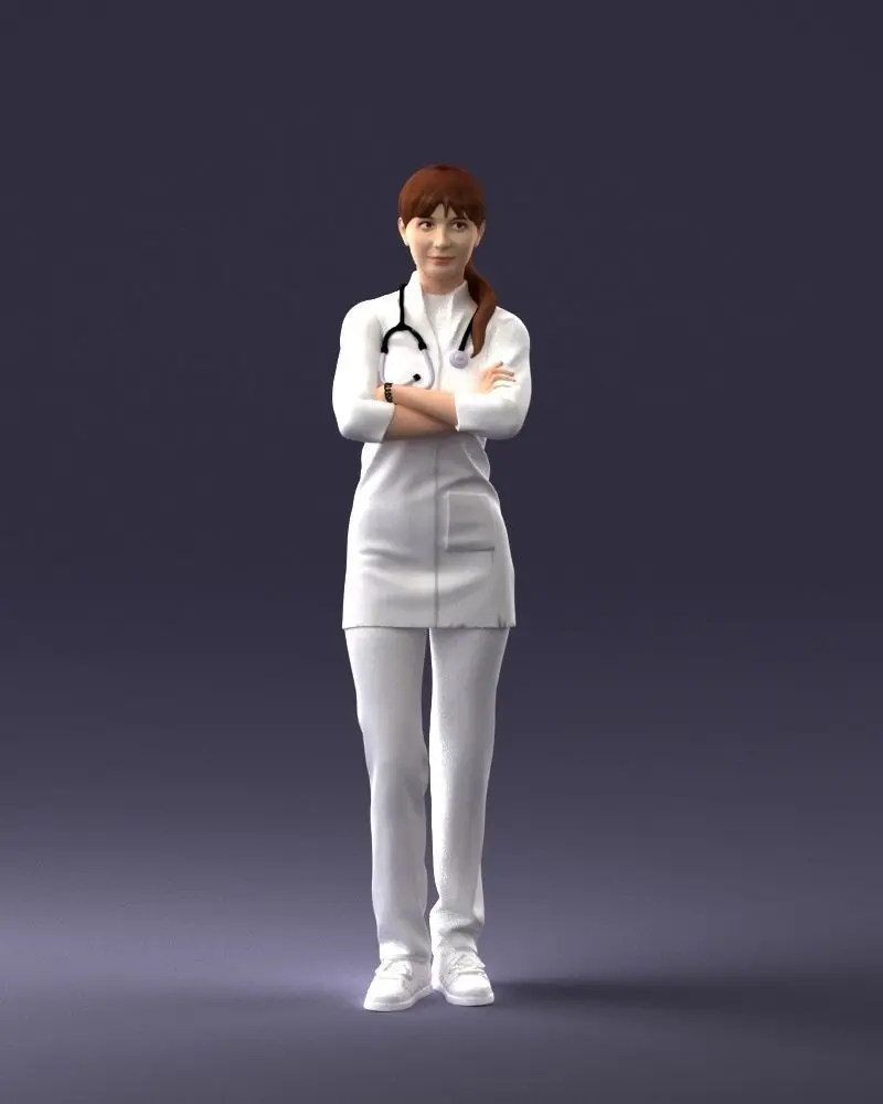 This photorealistic 3D model presents a female doctor standing confidently with arms crossed, wearing a modern white medical uniform and stethoscope around her neck. Captured using 3D scanning technology, the model features highly detailed clothing folds, natural body proportions, and realistic textures, making it suitable for creative or professional projects requiring realistic human characters in medical, clinical, or scientific environments.