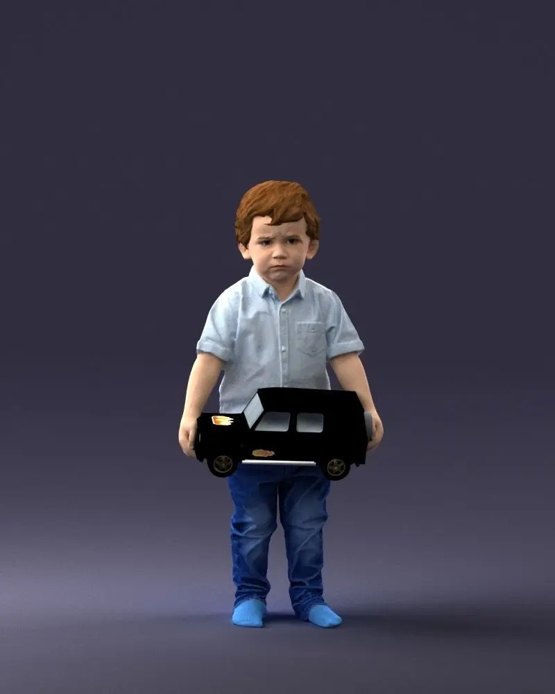 This is a high-quality 3D scanned figurine of a small boy standing barefoot, holding a toy truck with a sad expression on his face. The model captures realistic clothing folds, posture, and emotional detail, making it a unique collectible or a touching addition to dioramas, themed figurine sets, or gift projects. This printable model was created using professional 3D scanning technology to ensure accurate proportions and surface detail for smooth printing and easy post-processing.