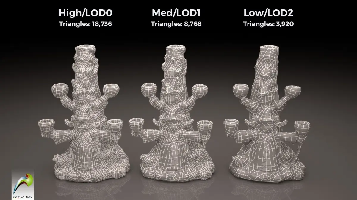 - One model divided into 3 LOD levels; level 0, 1, and 2.
