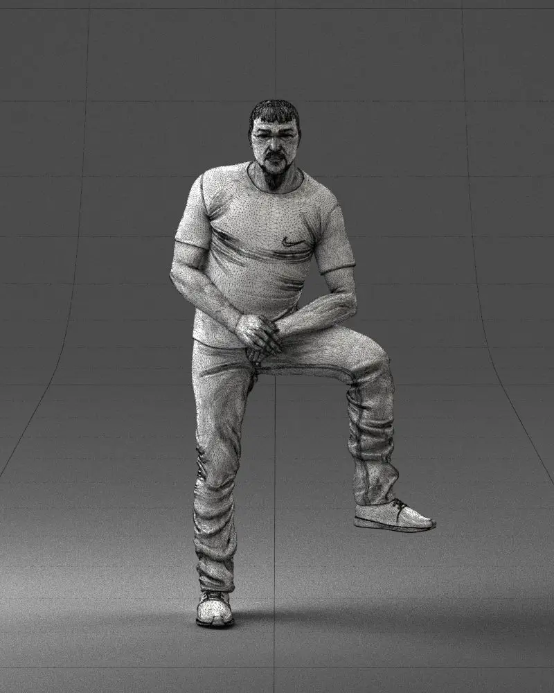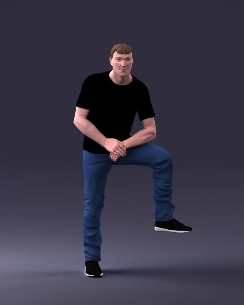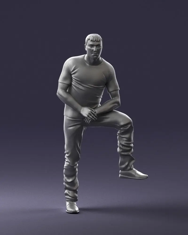 3D printable figurine of a strong man in a casual outfit, captured in a distinctive pose with one knee raised. Created using 3D scanning technology, this model is ideal for fitness enthusiasts, collectors, and hobbyists.