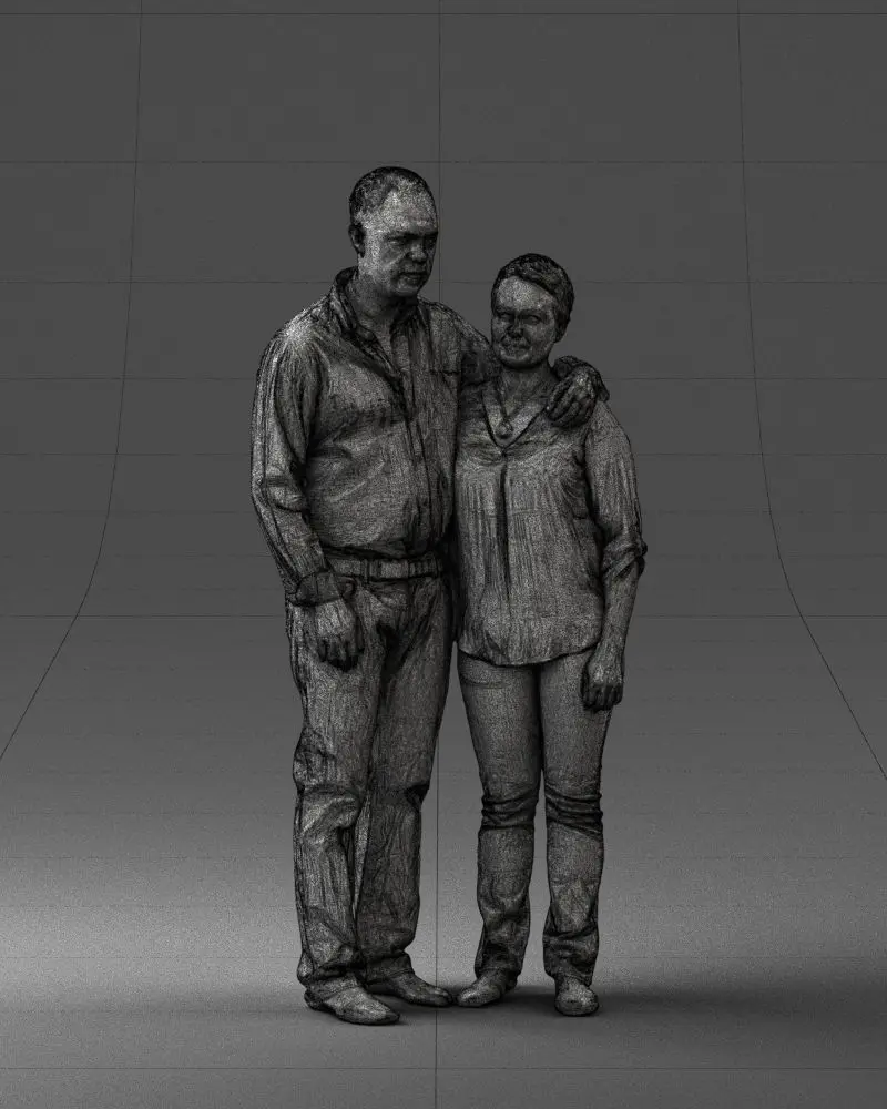 3D printable figurine of a couple standing close together, with the man’s arm gently placed around the woman’s shoulders. Created using 3D scanning technology, this model captures realistic details of clothing, posture, and human expressions.