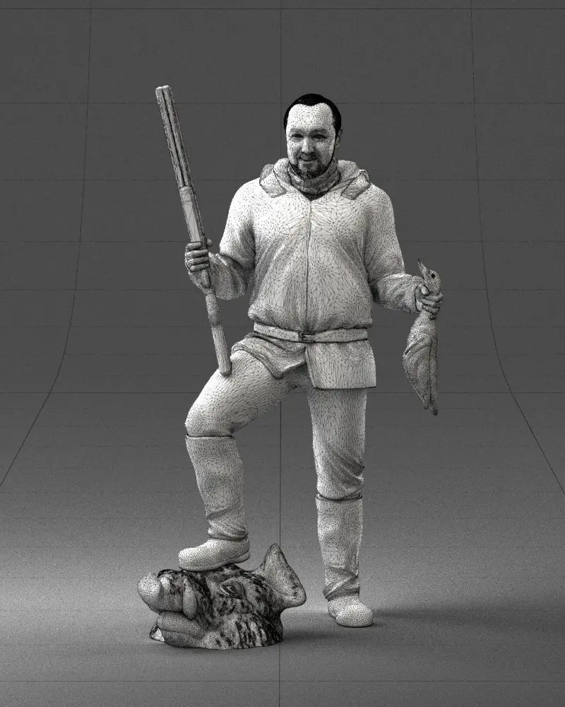 This detailed 3D model represents a hunter standing proudly with a rifle in one hand, a bird in the other, and his boot resting on a wild boar’s head. Captured with professional 3D scanning technology, the model preserves natural proportions, clothing folds, and lifelike expression.