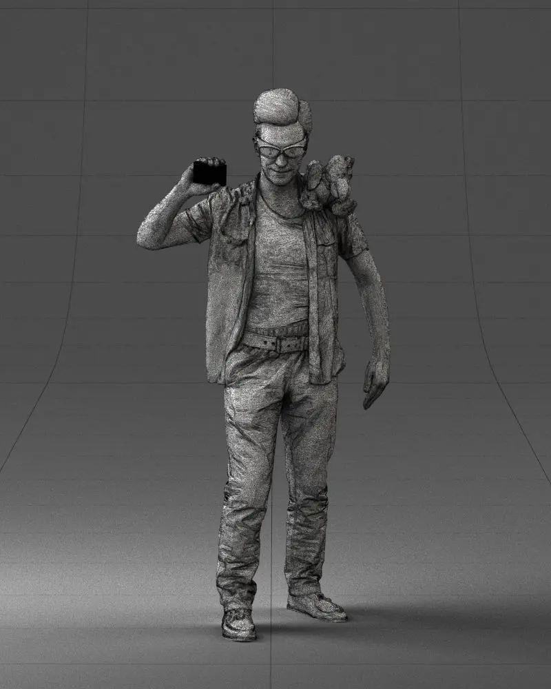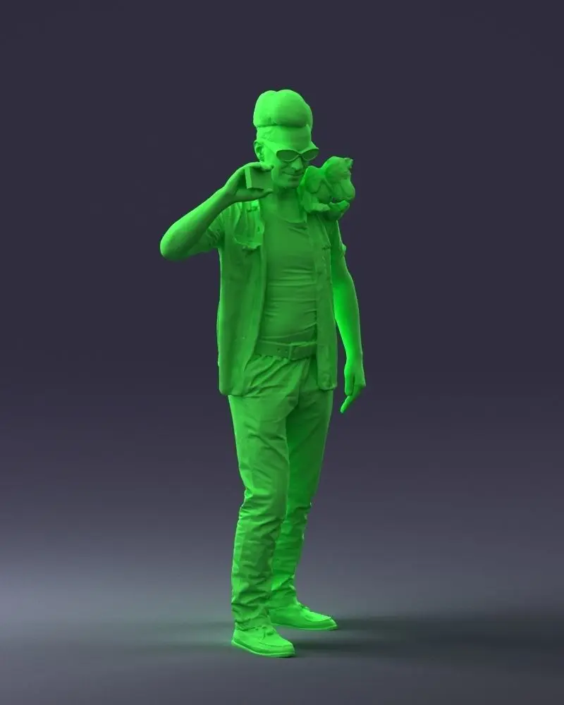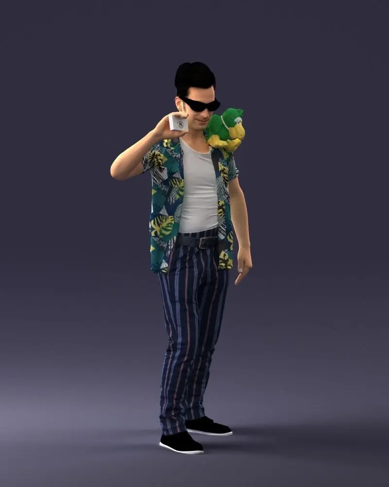 Detailed 3D printable model of a humorous detective with a parrot, produced via 3D scanning for precise anatomical proportions and clothing folds. The model is optimized for resin and FDM printing, ideal as a collectible or display piece for fans of quirky, comic characters.