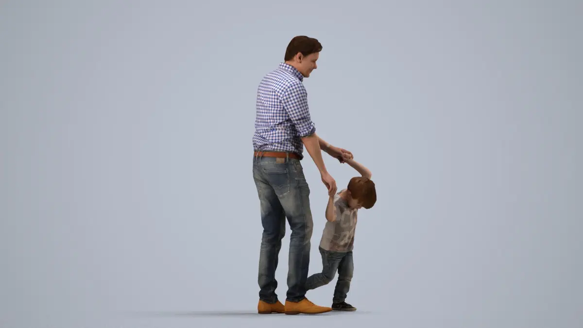 a man holding onto a little boy's h