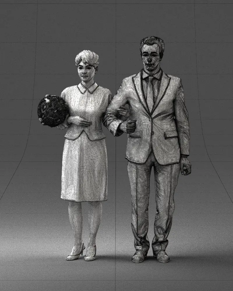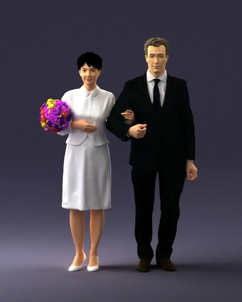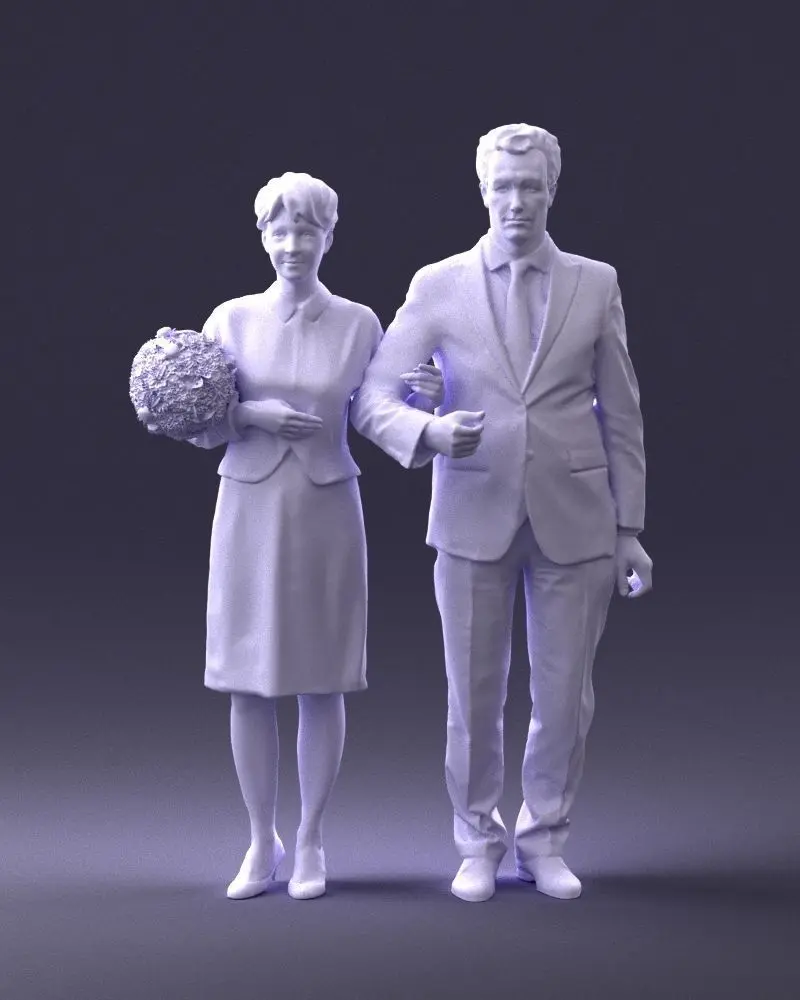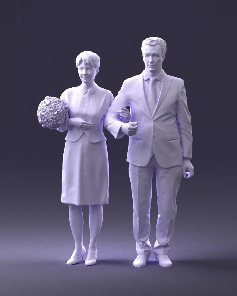 High-quality 3D printable model of a formal couple, accurately recreated through 3D scanning technology for lifelike proportions and elegant detailing.The model captures a man and woman standing together, the woman holding a bouquet — an excellent choice for wedding figurines, collectible sculptures, or diorama decoration.Model is watertight and optimized for 3D printing in resin or plastic.