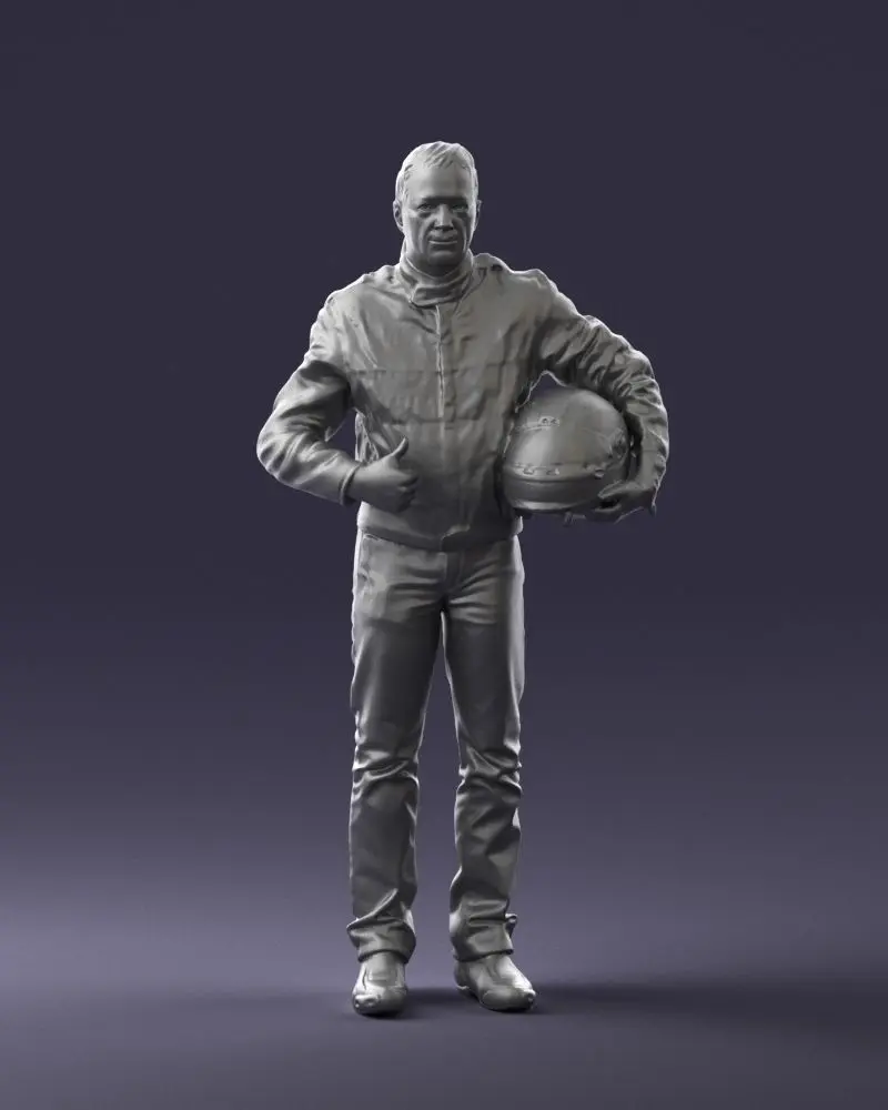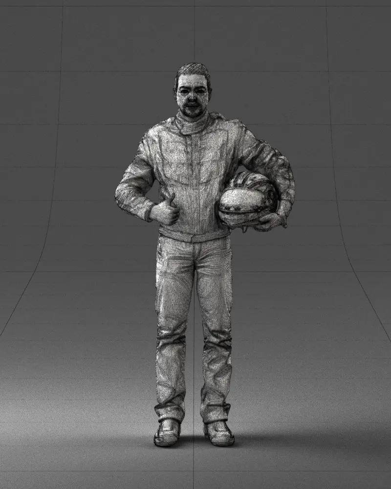 Highly detailed 3D model of a motorcyclist holding a helmet, created using advanced 3D scanning technology for exceptional realism in anatomy, clothing, and textures.The man is dressed in a high-visibility yellow riding jacket, protective pants, and gloves, with a helmet under his arm — an ideal asset for urban, racing, or professional visualization scenes requiring realistic human characters.Perfect for CG environments, advertising, film previsualization, and interactive renderings.