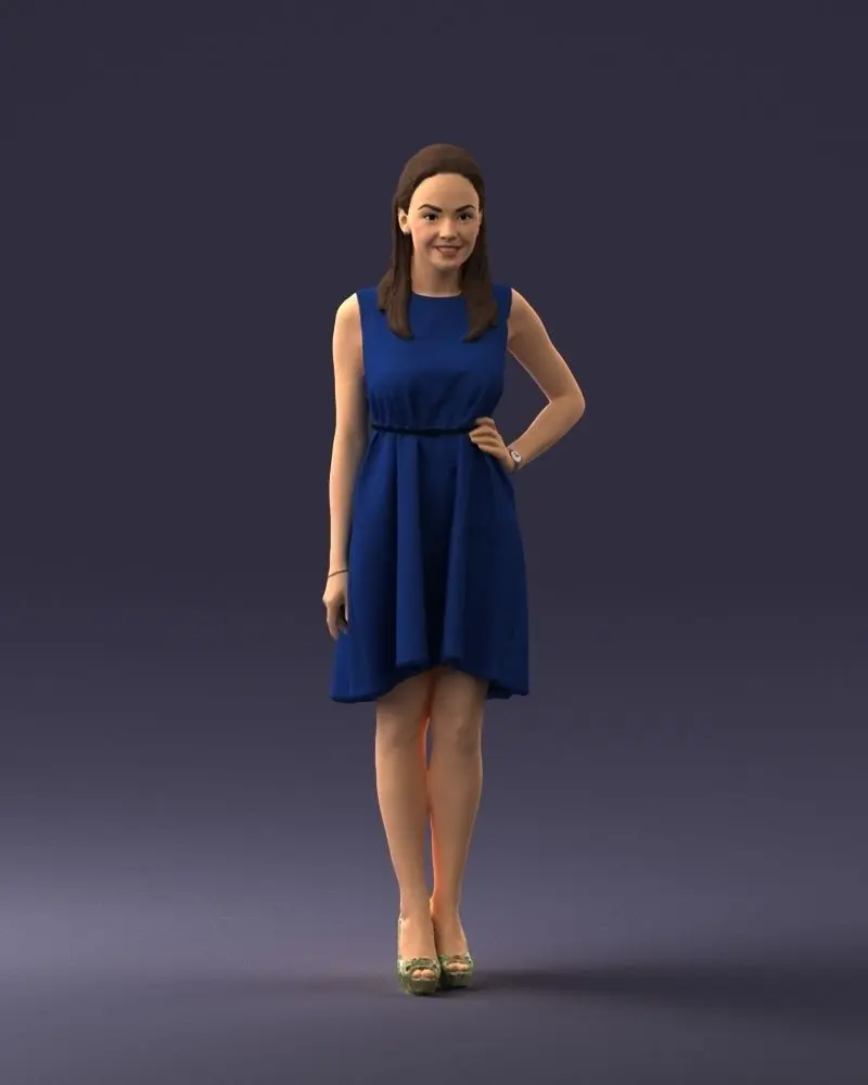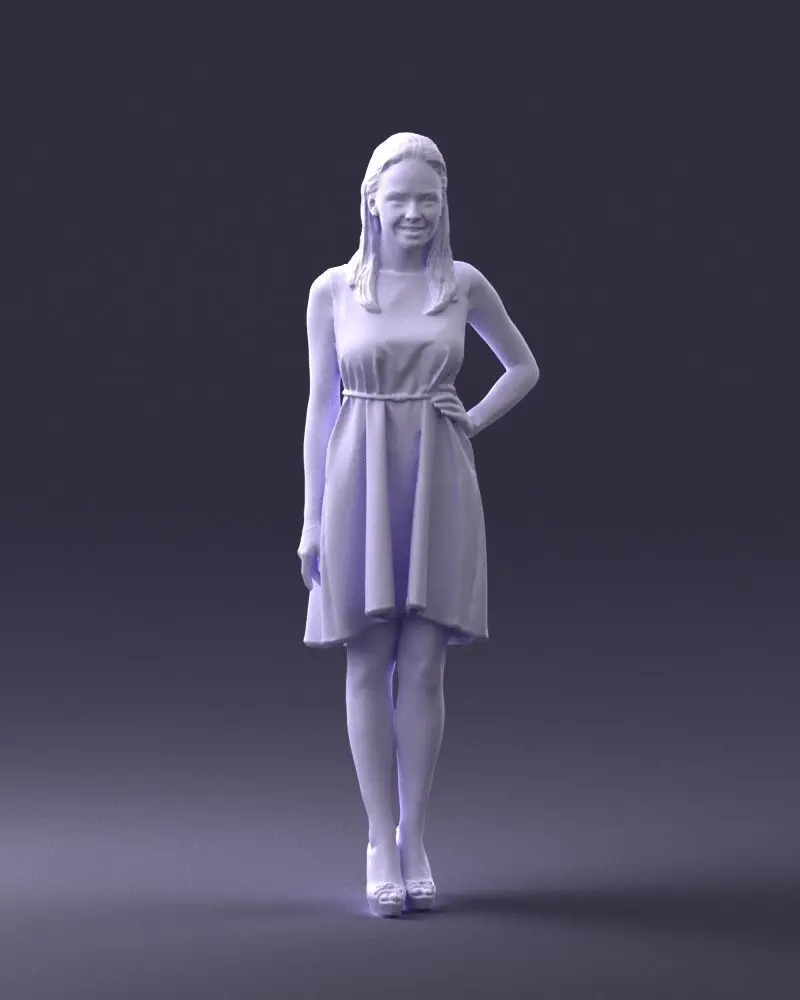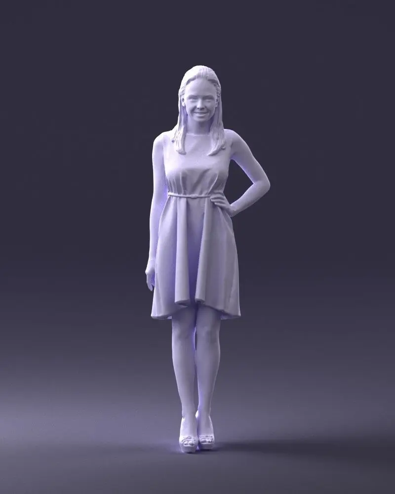 A high-detail 3D printable model of a woman in a dress, optimized from professional 3D scanning data. The model is suitable for FDM, SLA, and SLS printing, with clean geometry and natural proportions. Perfect for figurines, collectible miniatures, dioramas, and display models.