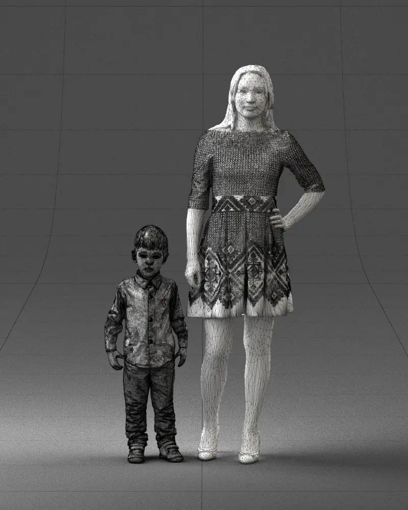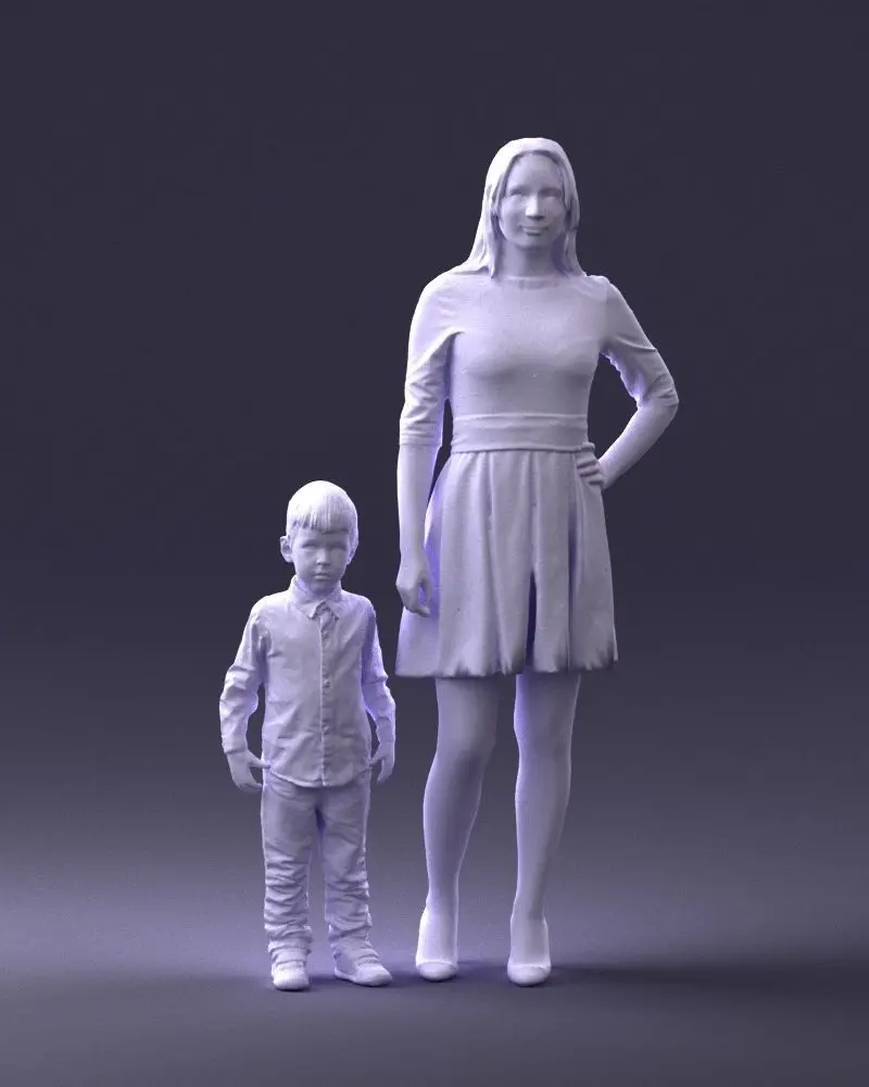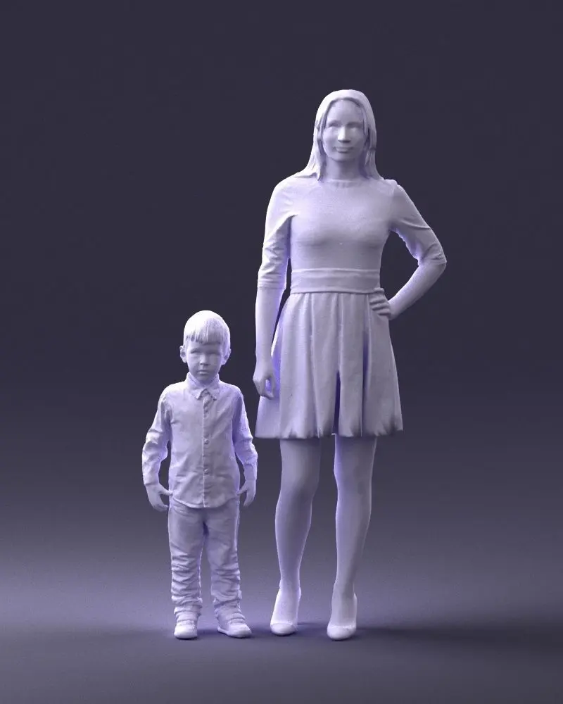 This 3D printable realistic family figurine set includes a woman and a young boy captured together in a calm, upright pose, ideal as a memorable décor object or personalized collectible. The model is created using advanced 3D scanning technology to retain authentic silhouettes, expressive life-like stance, and clothing detail realism suitable for resin, SLA, SLS, DLP and FDM printing workflows.