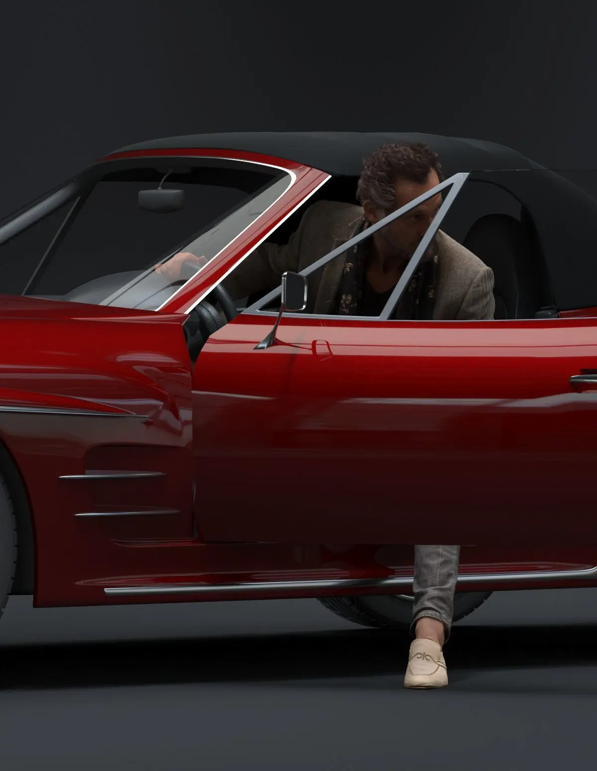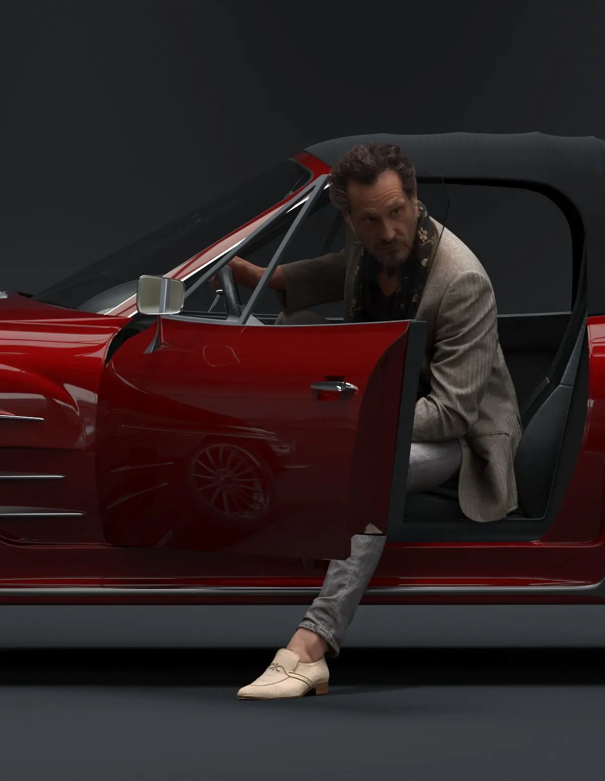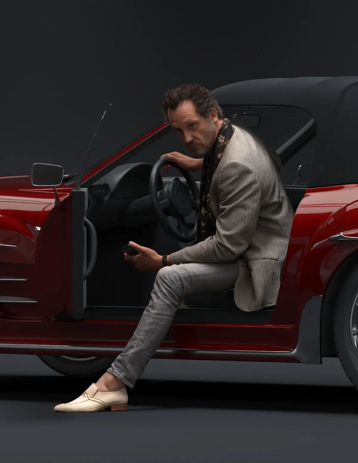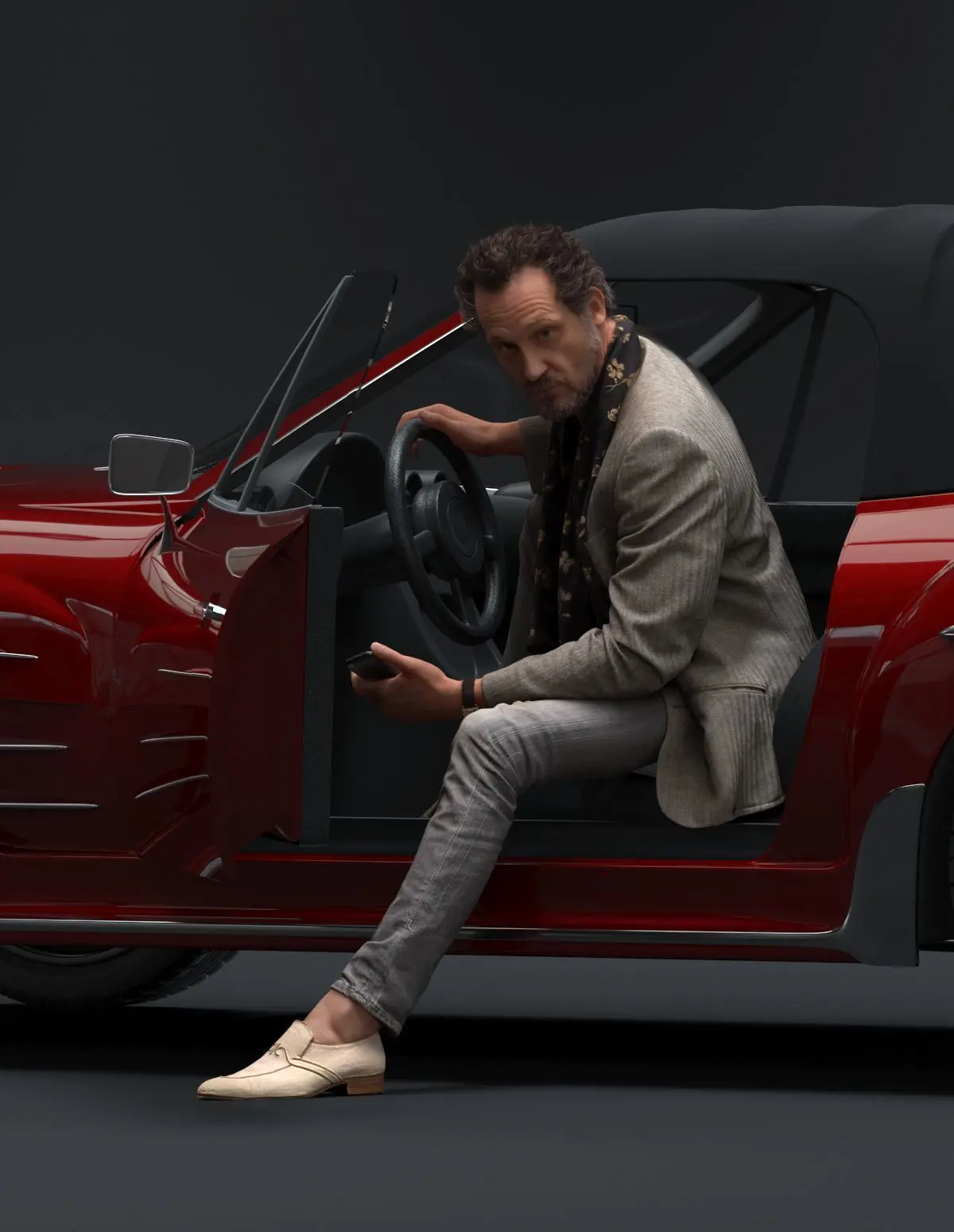 Pre posed male 3D model with fashionable attire stepping out of a red car holding a mobile