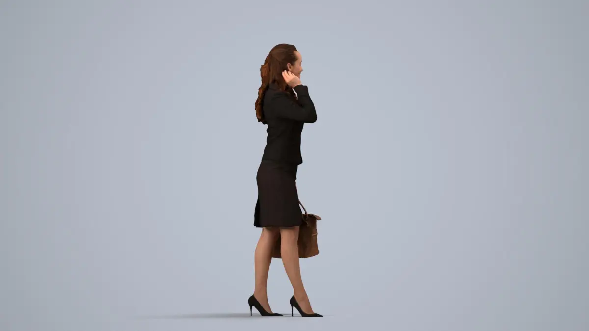 a woman in a business suit is talking on the phone