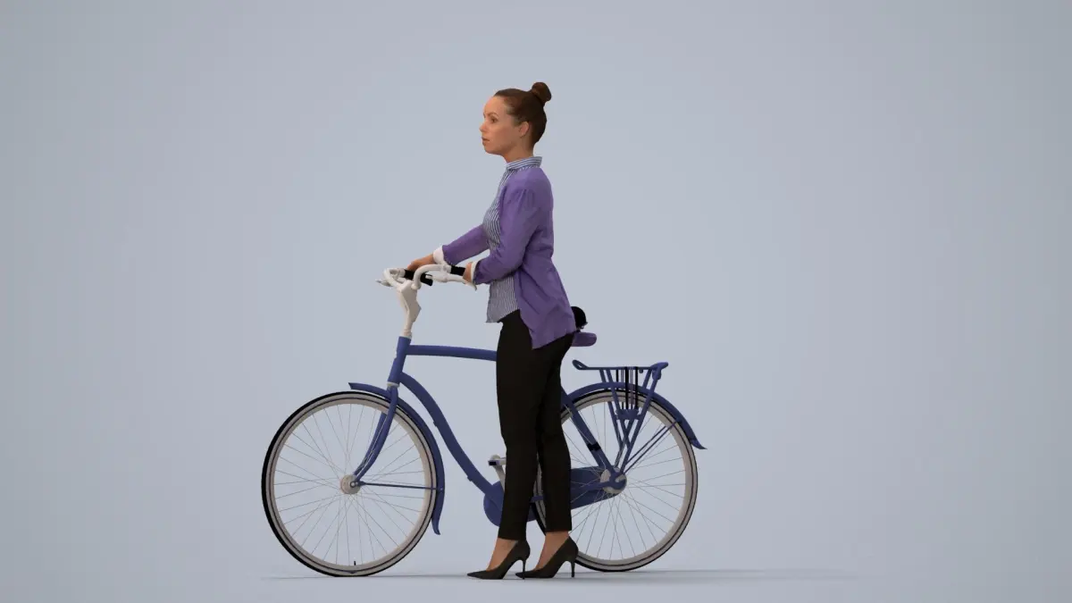 a woman next to a blue bicycle