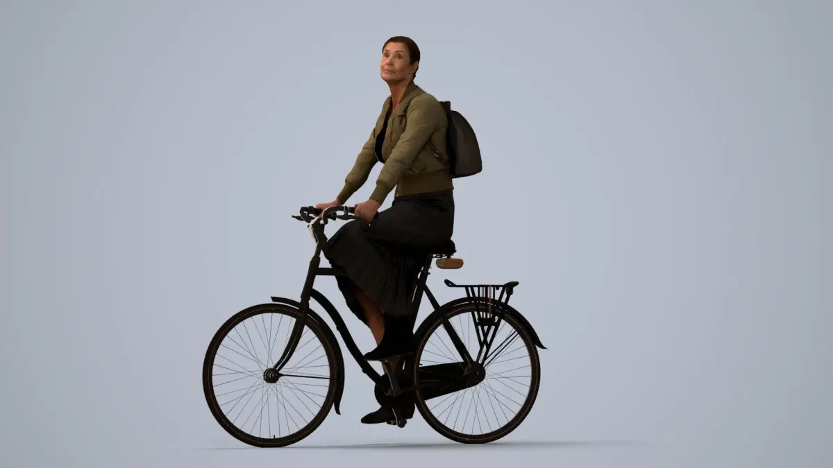 a woman riding a bike on a gray background