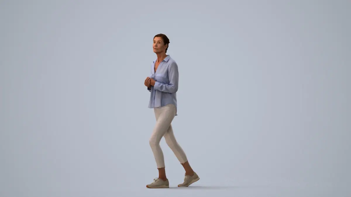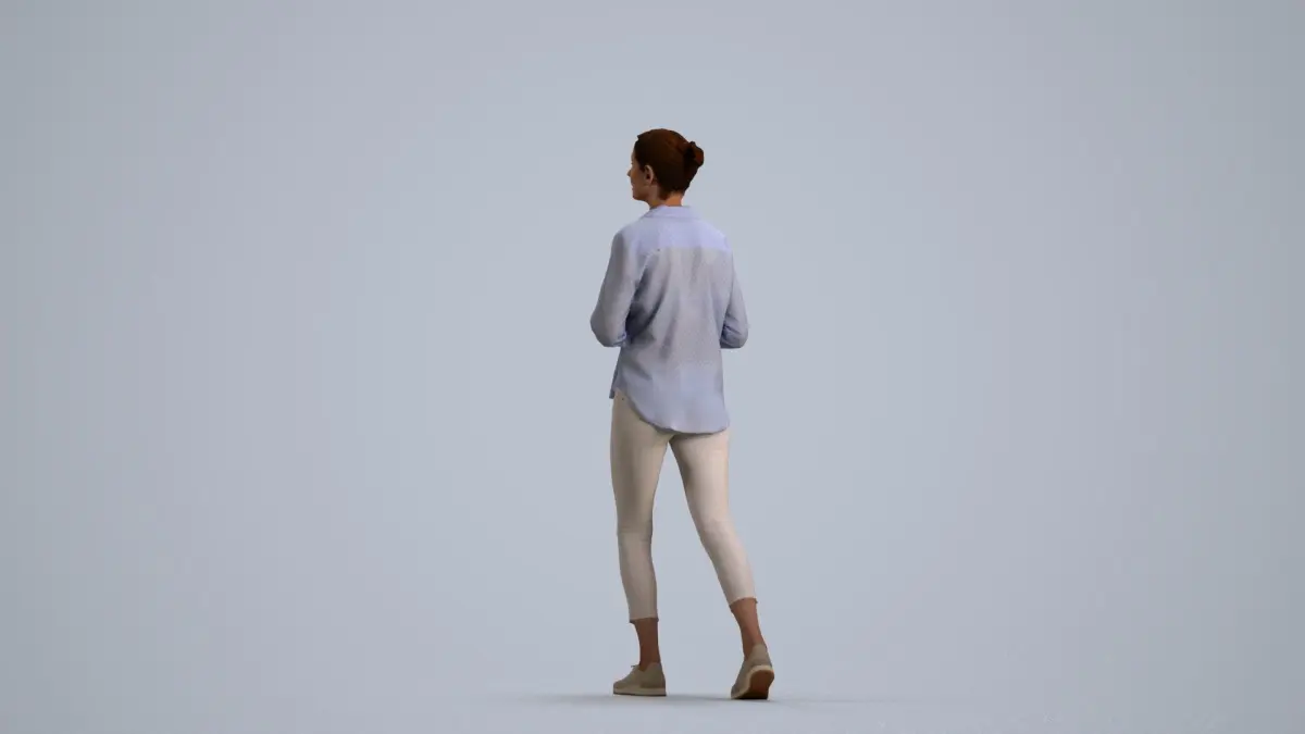 a woman in a blue shirtwhite pants
