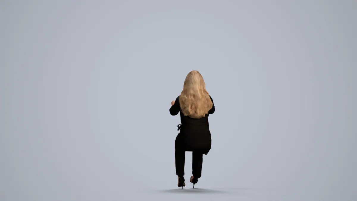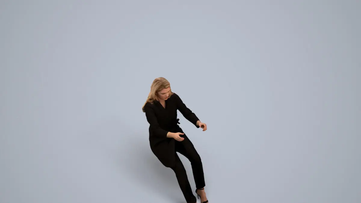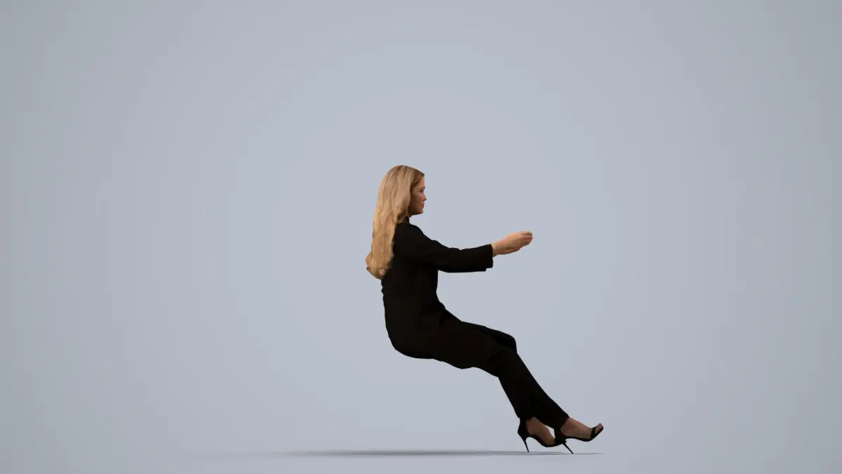 a woman in a black suit sitting on a stool