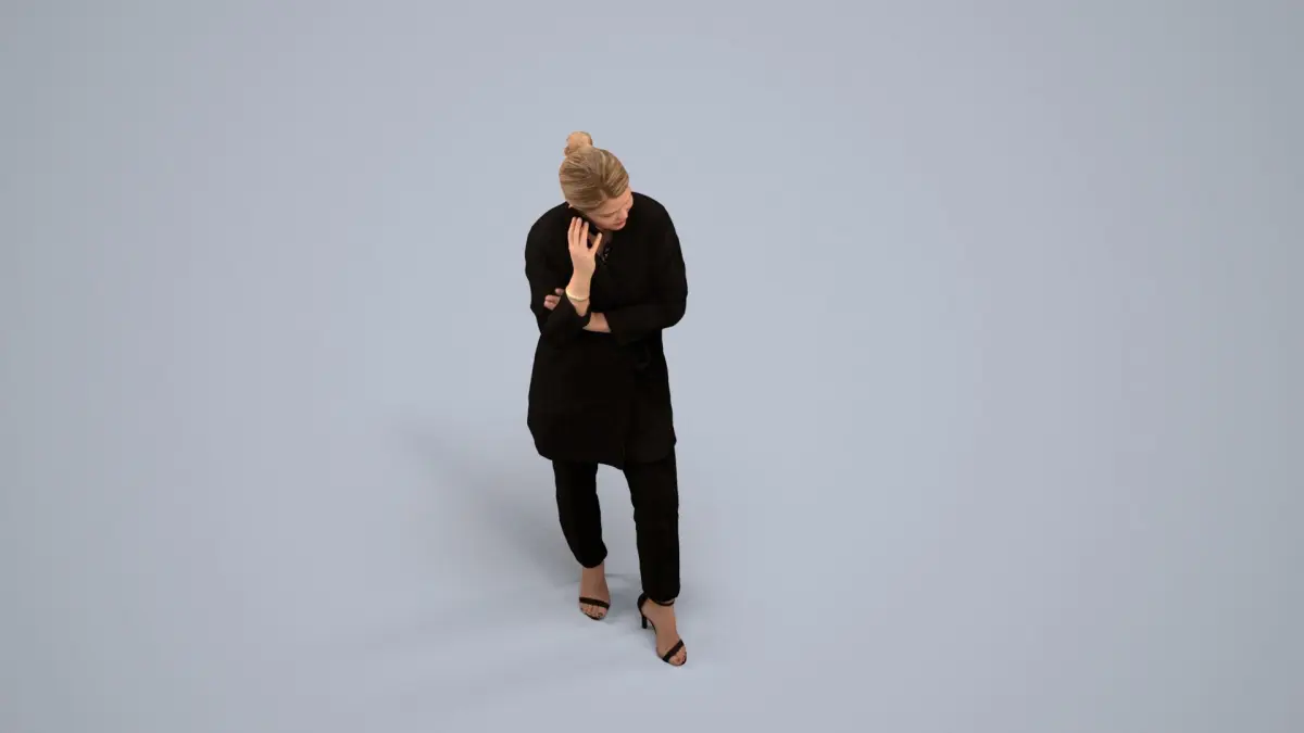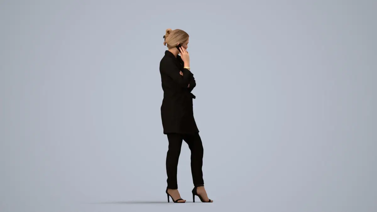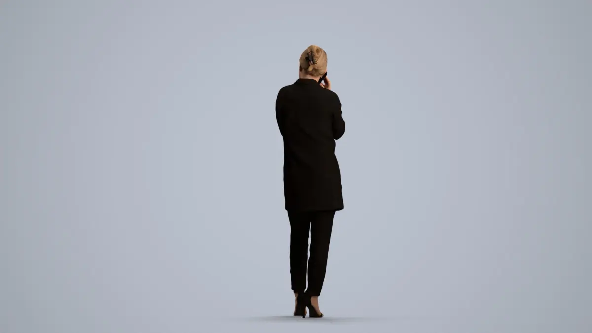 a woman in a black suit talking on a cell