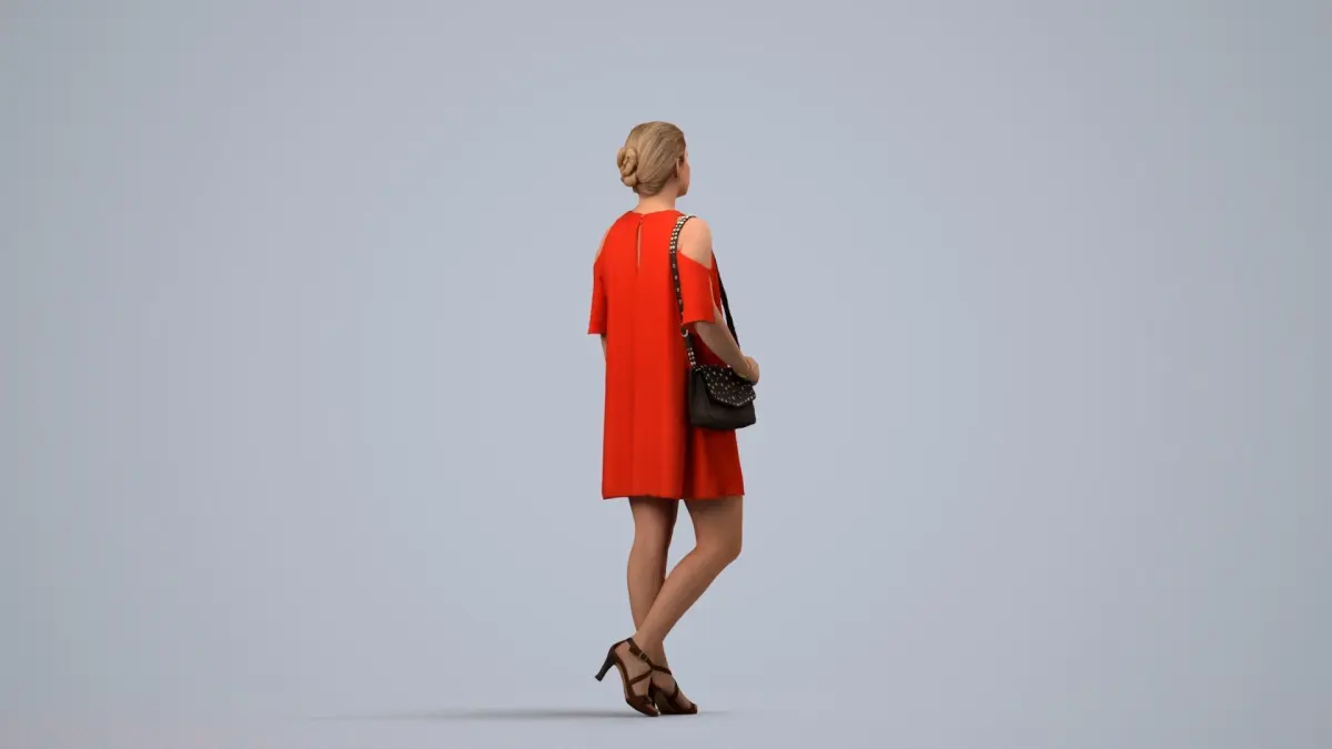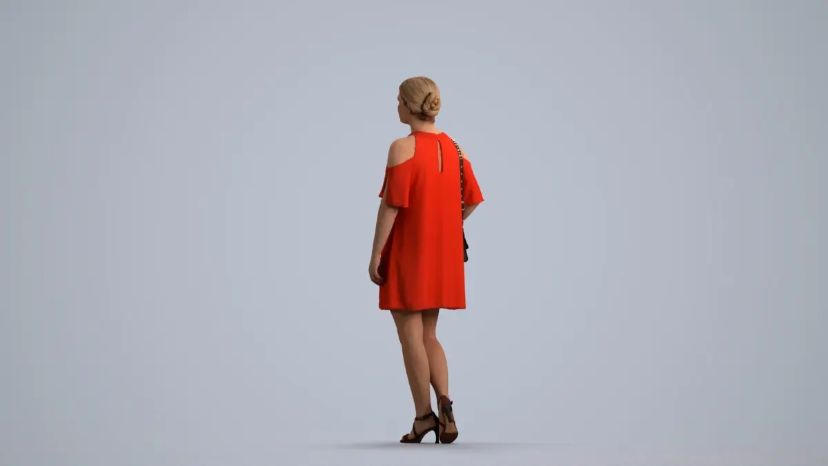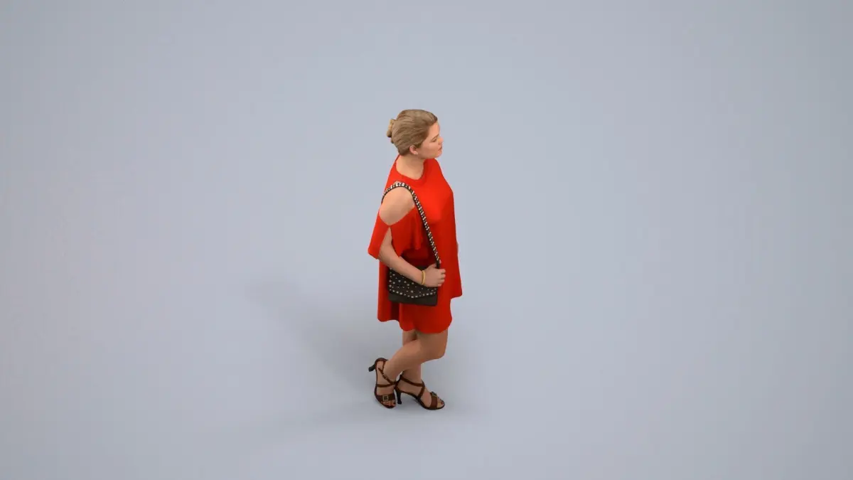 a woman in a red dress is holding a purse