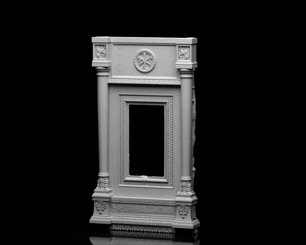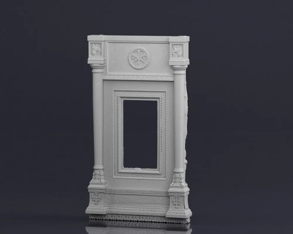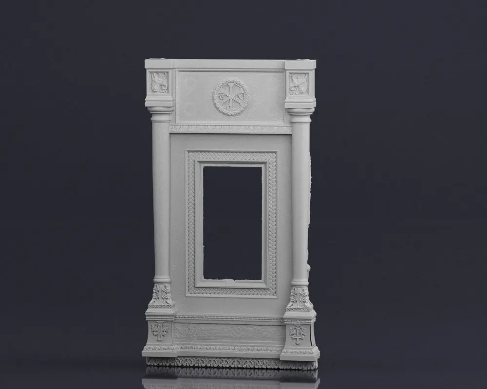 This is a raw 3D scan of a floor-standing kiot (icon case) featuring detailed ornamental elements, columns, and Christian symbolism. The intricate carvings and architectural details showcase its historical and religious significance. The model is perfect for digital restoration projects, historical visualization, or as a base for further 3D modeling work. Due to its raw scan state, additional post-processing is required to make it fully optimized for 3D printing or rendering.