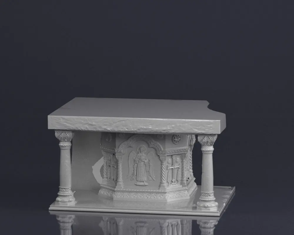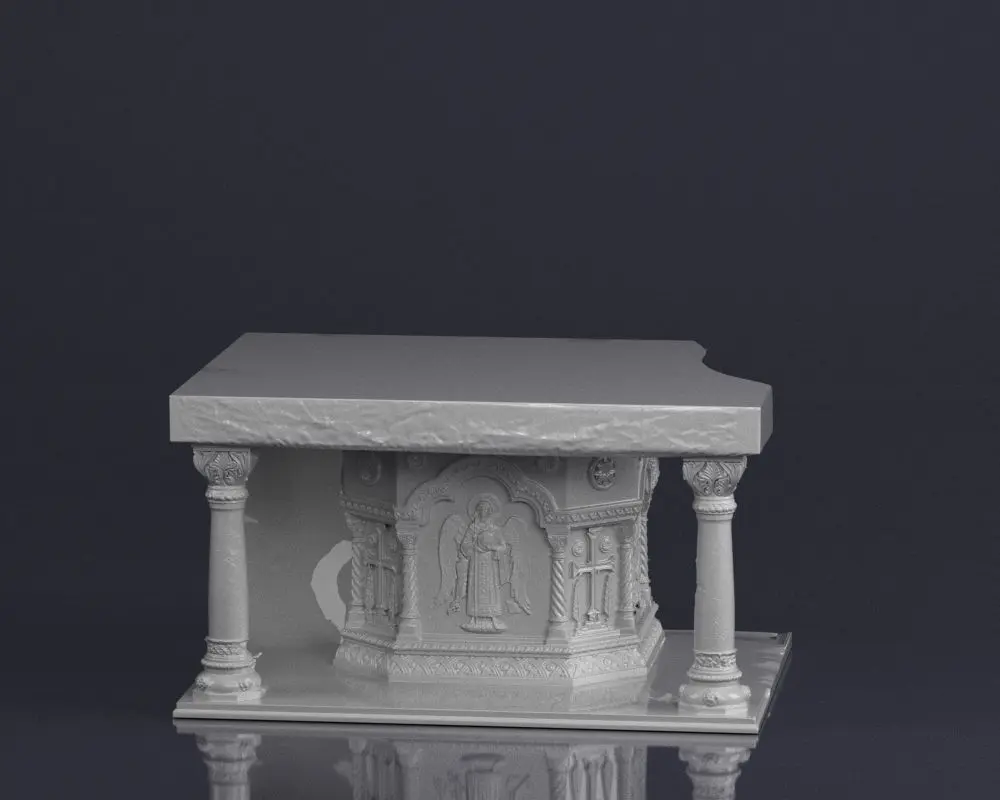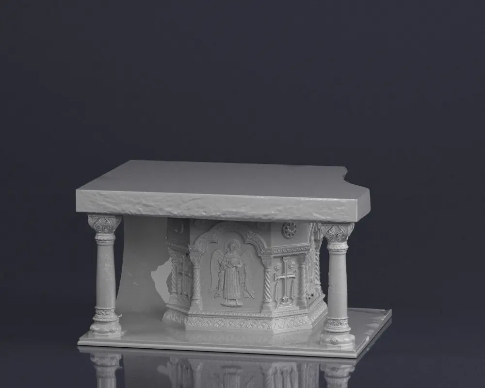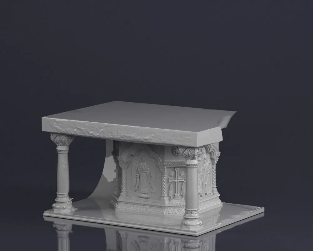 This is a raw scan of a church altar (prestol), showcasing detailed carvings, columns, and ornate patterns. The design highlights traditional religious craftsmanship, featuring angelic imagery and intricate decorations on the columns. The model is presented in its original scanned form and requires processing for 3D printing or further use. This 3D model is ideal for restoration projects, digital preservation, or as a reference for creating replicas or custom designs in religious and architectural art.