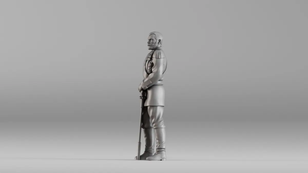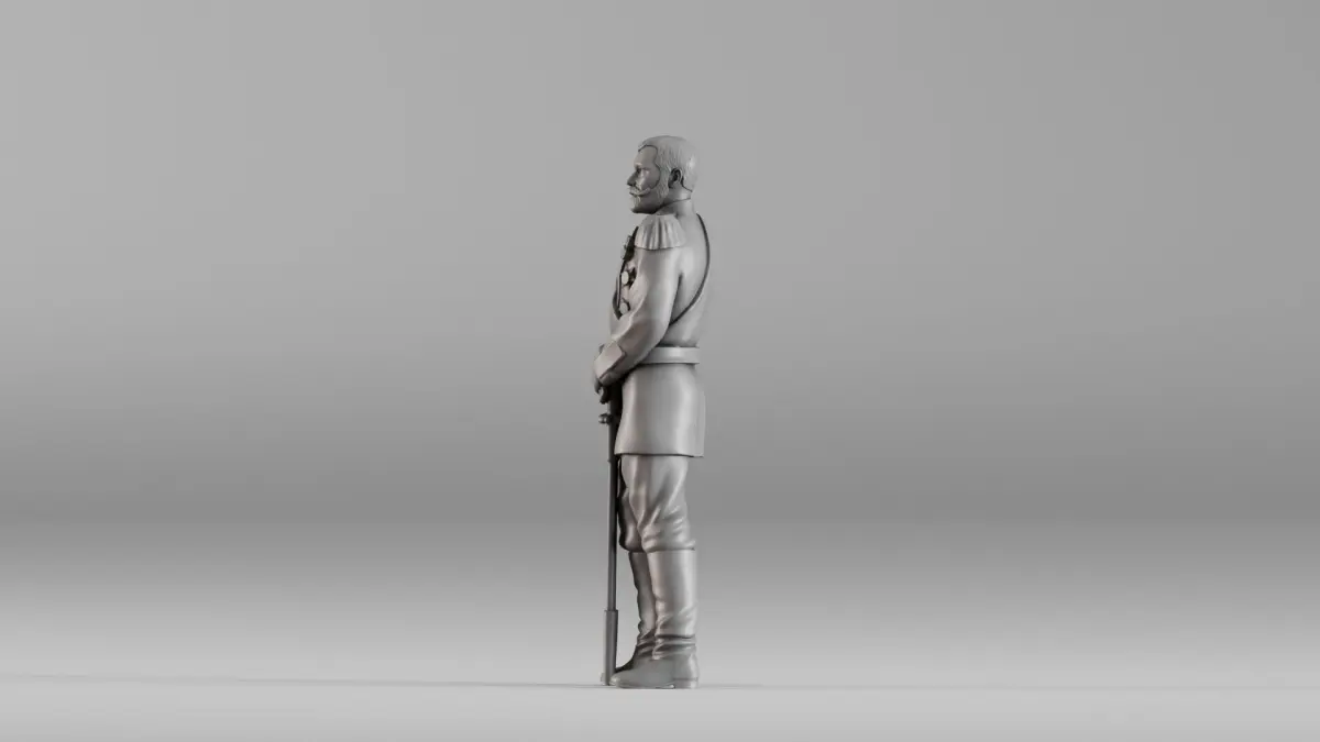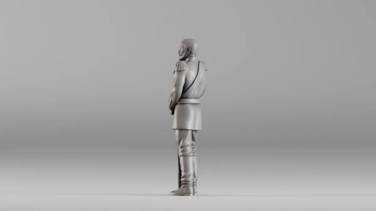 This is a high-resolution 3D model of Tsar Nicholas II, standing in full military uniform with a ceremonial sword. Designed for historical dioramas, collectible miniatures, or educational displays, the model captures lifelike posture and uniform detail—from the decorations and shoulder epaulets to the refined facial features and pose. Originally created using 3D scanning technology and refined for 3D printing, the model is hollowed and tested for watertight integrity, making it ideal for resin or FDM printing.