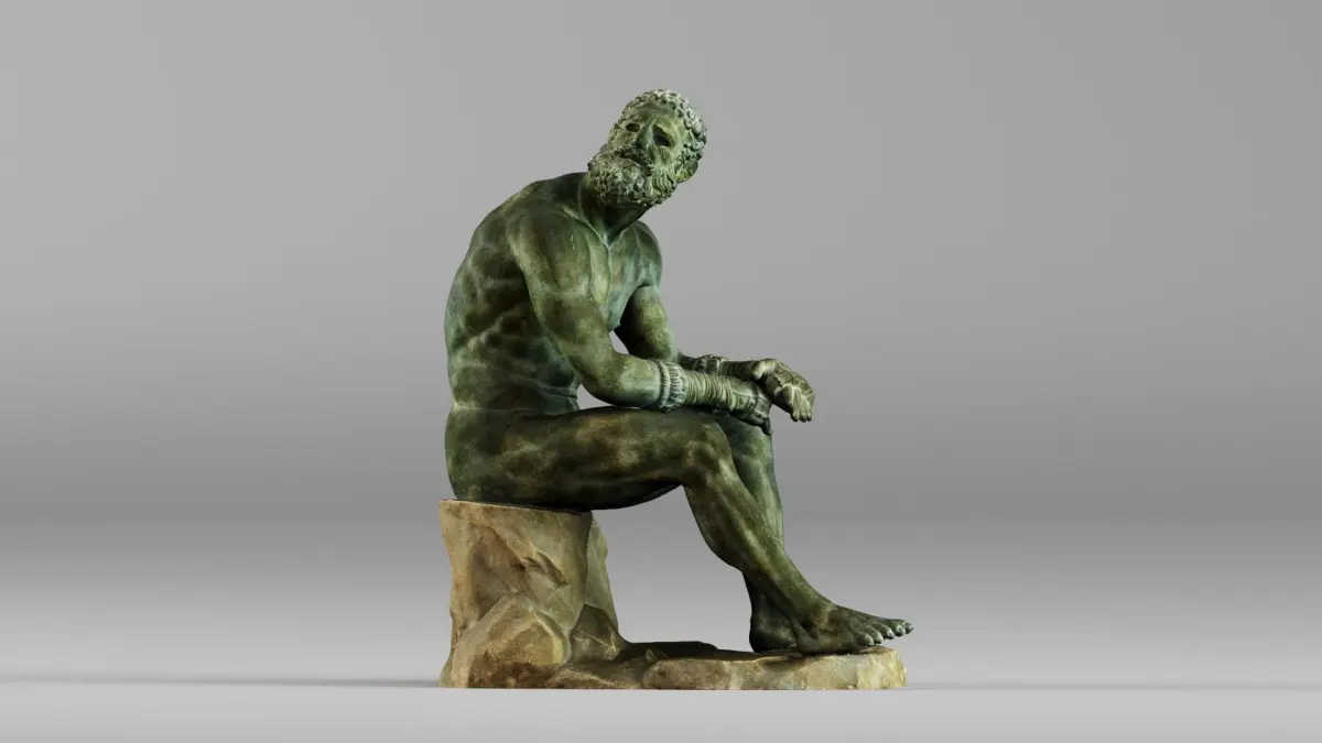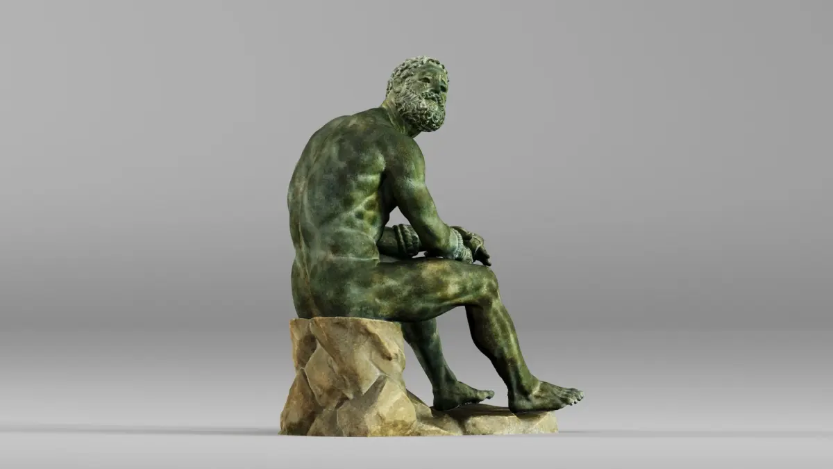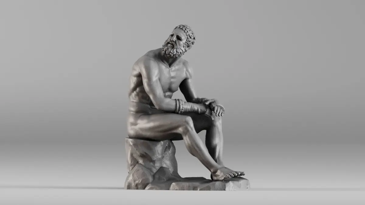 This 3D scanned model represents a seated ancient boxer, also known as the Boxer at Rest, with detailed musculature, realistic proportions, and expressive posture. Capturing the weariness and strength of a classical Greek athlete, the model is ideal for museum-quality visualizations, educational reconstructions, games, and creative or professional projects requiring realistic human characters. The scanned details preserve the essence of the bronze surface, hand-wrapped leather gloves, and classical physique.