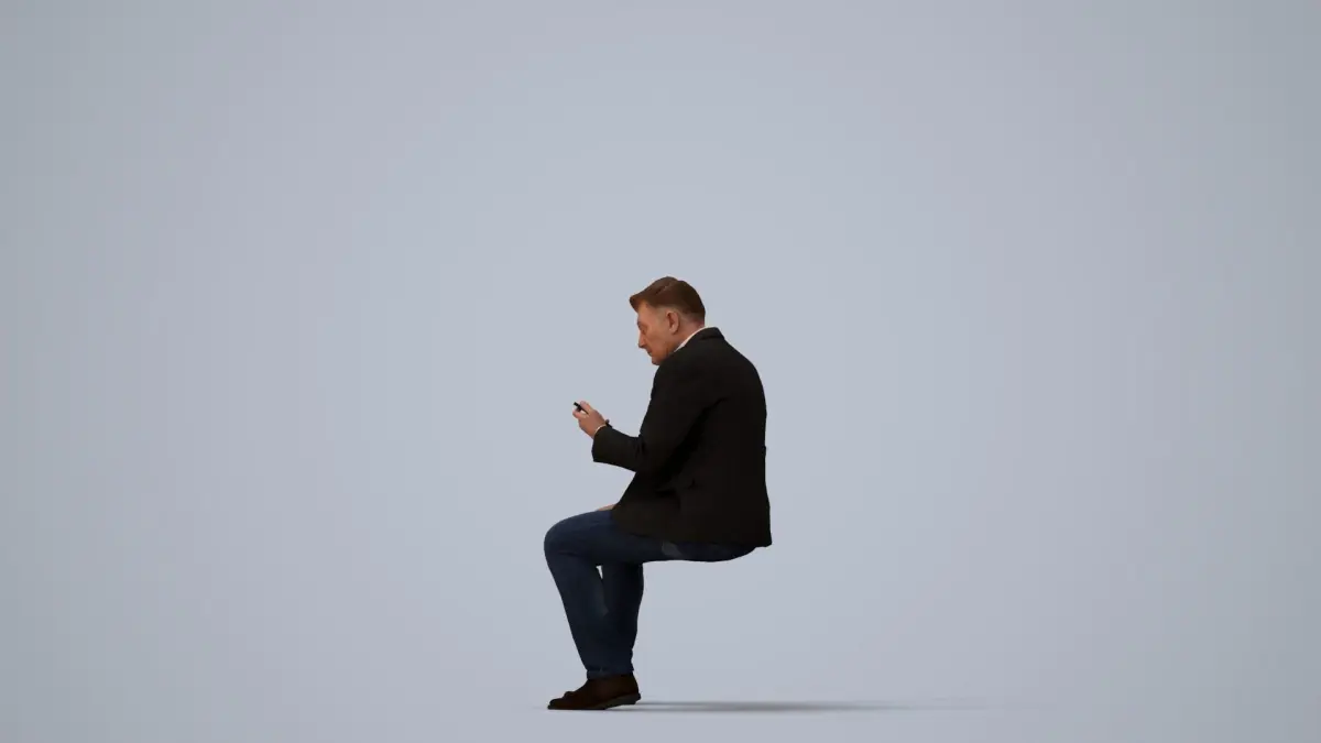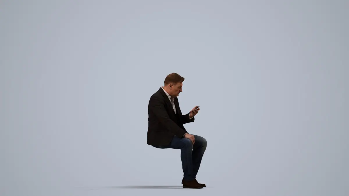 a man sitting on a cube looking at his phone