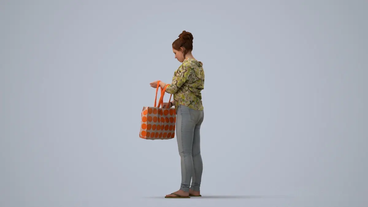 a woman holding an orangewhite polka bag doing shopping