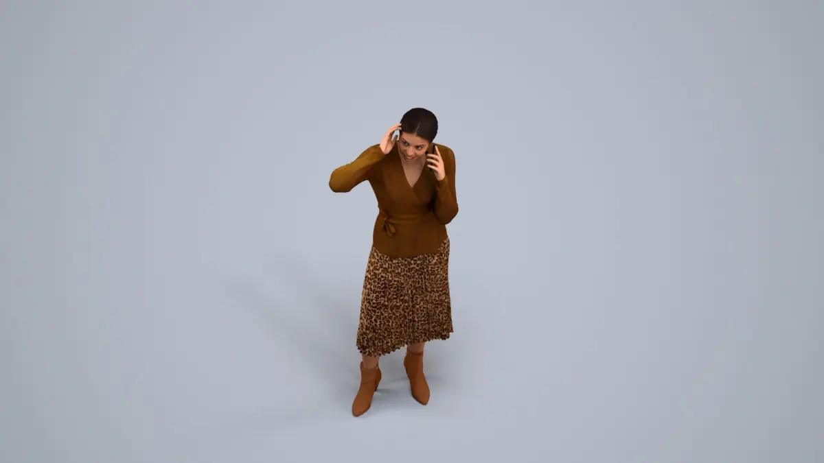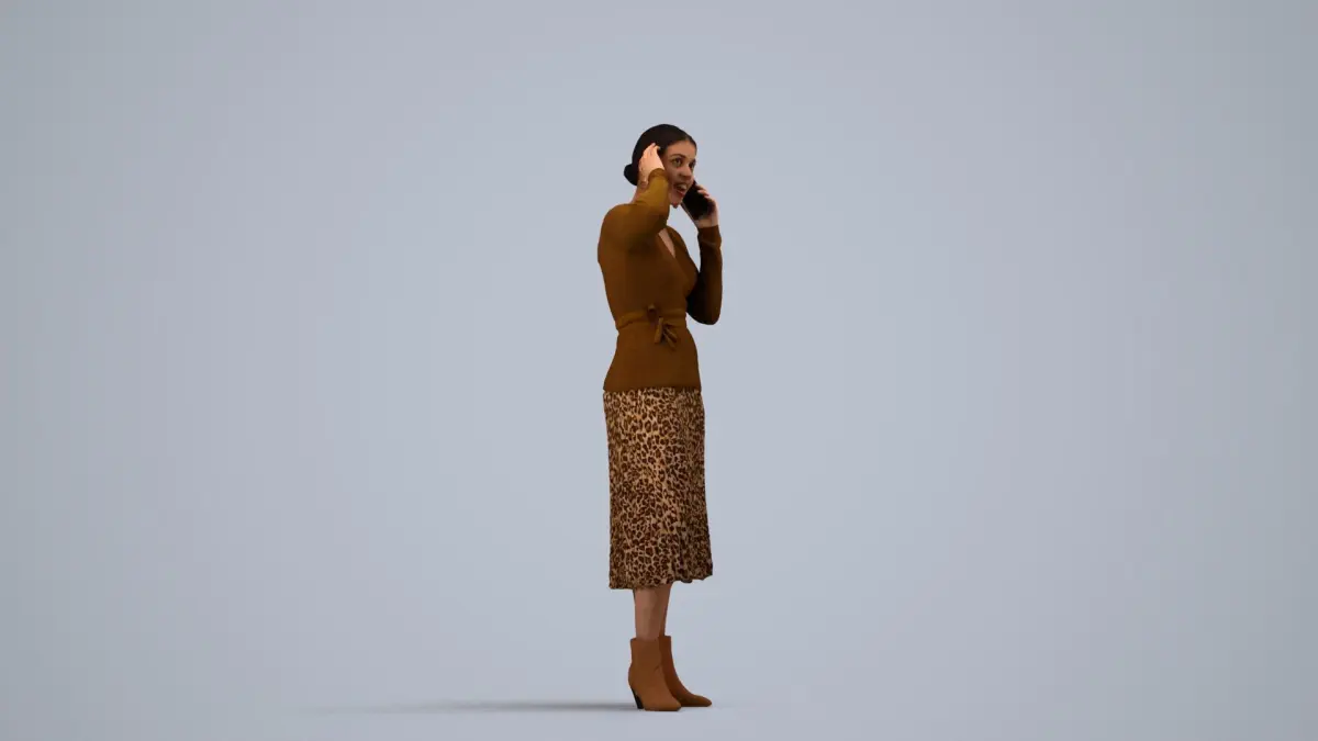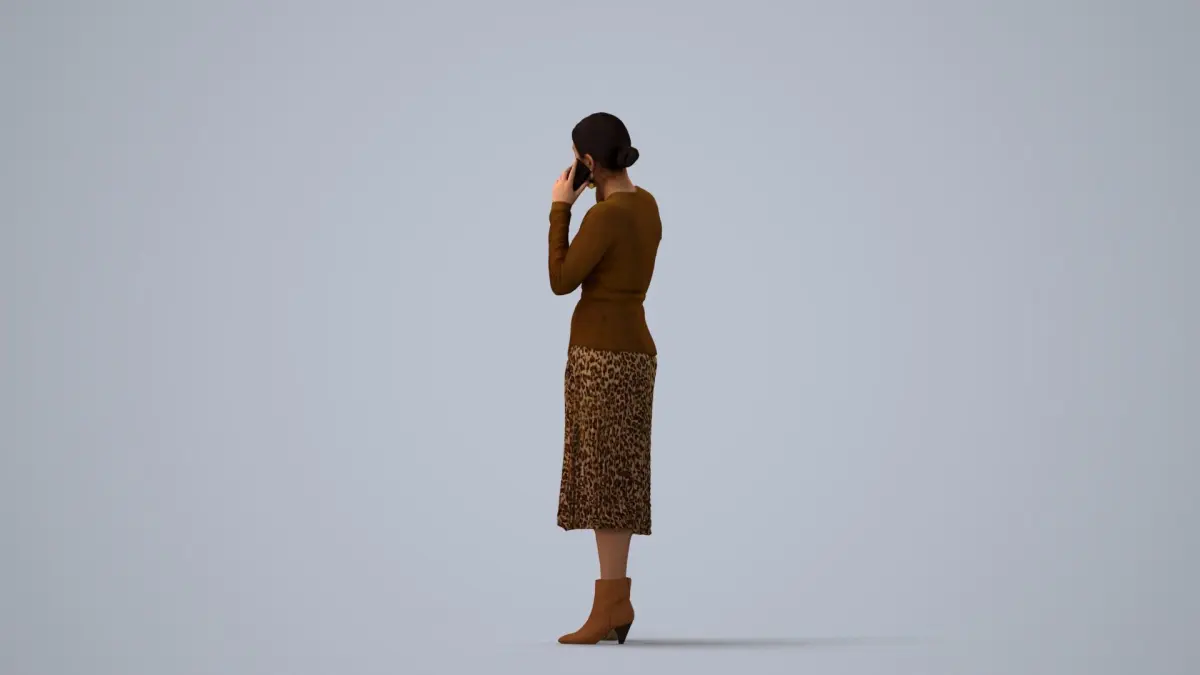 a woman in a brown sweaterleopard print skirt