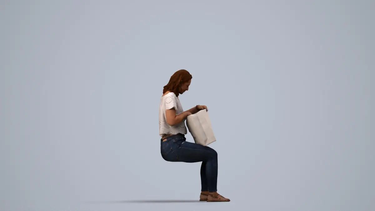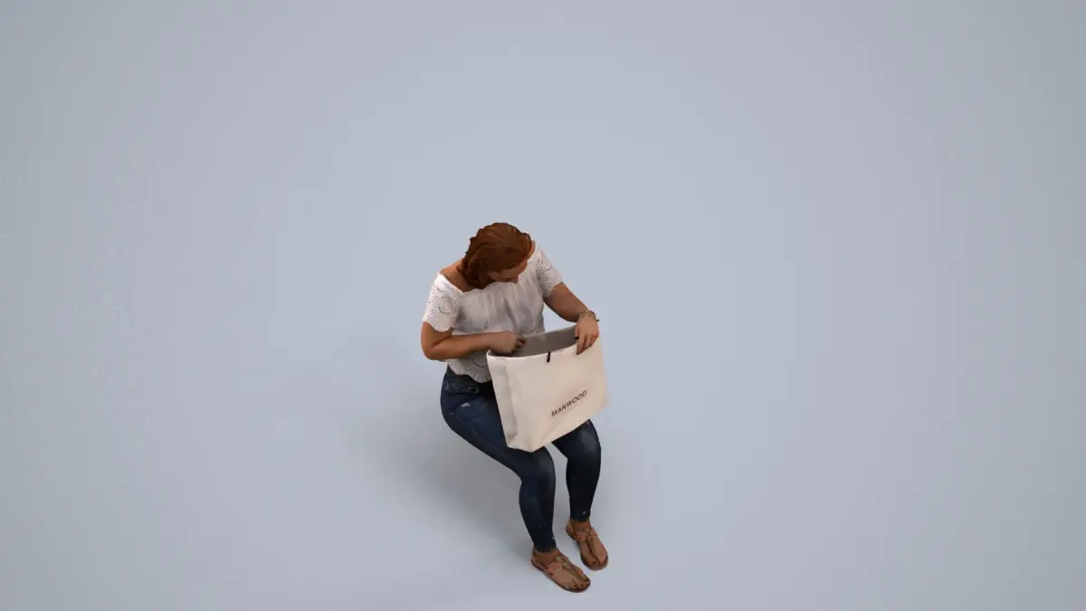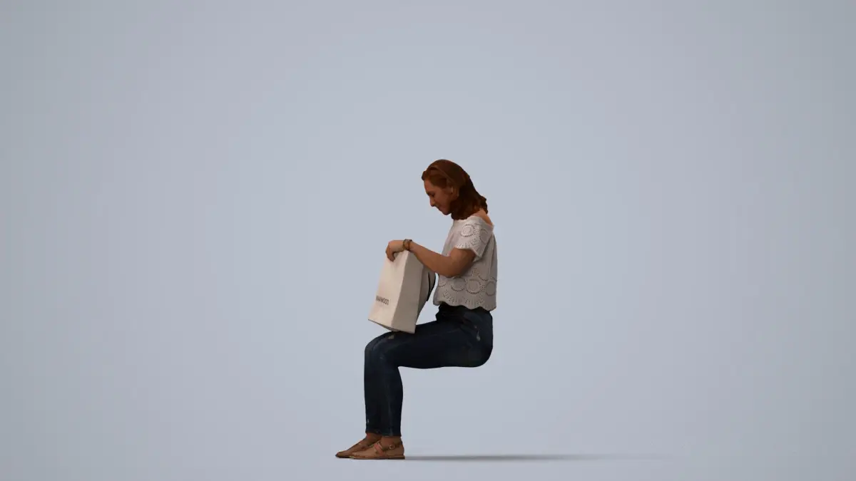 a woman sitting on a cube holding a bag