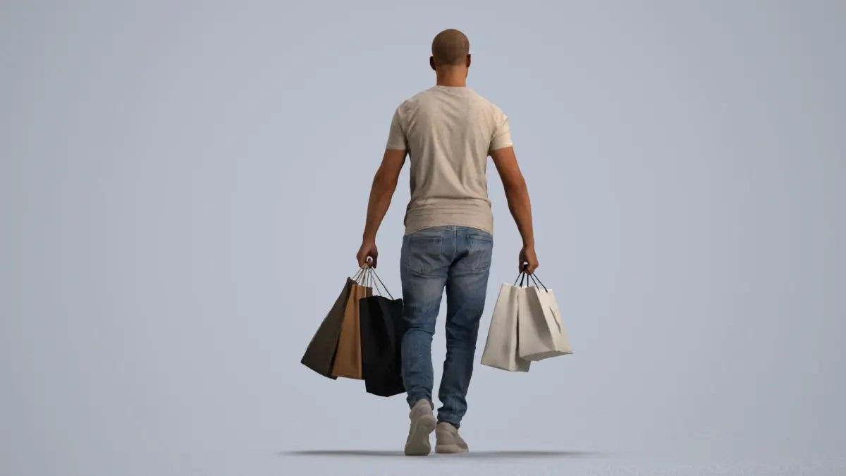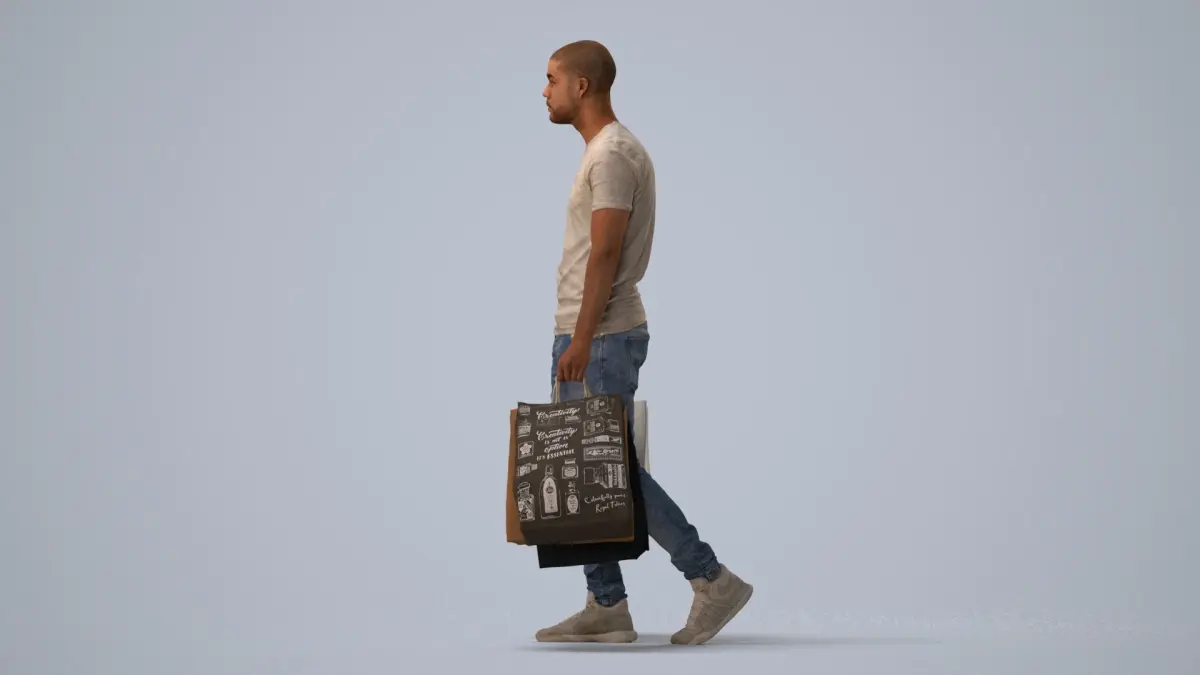 a man in a white t - shirt is holding shopping bags