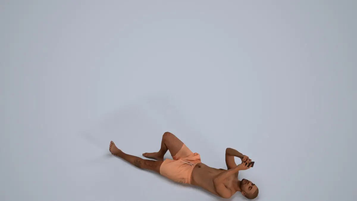 a man laying on the ground with her legs crossed using his phone at the beach or pool