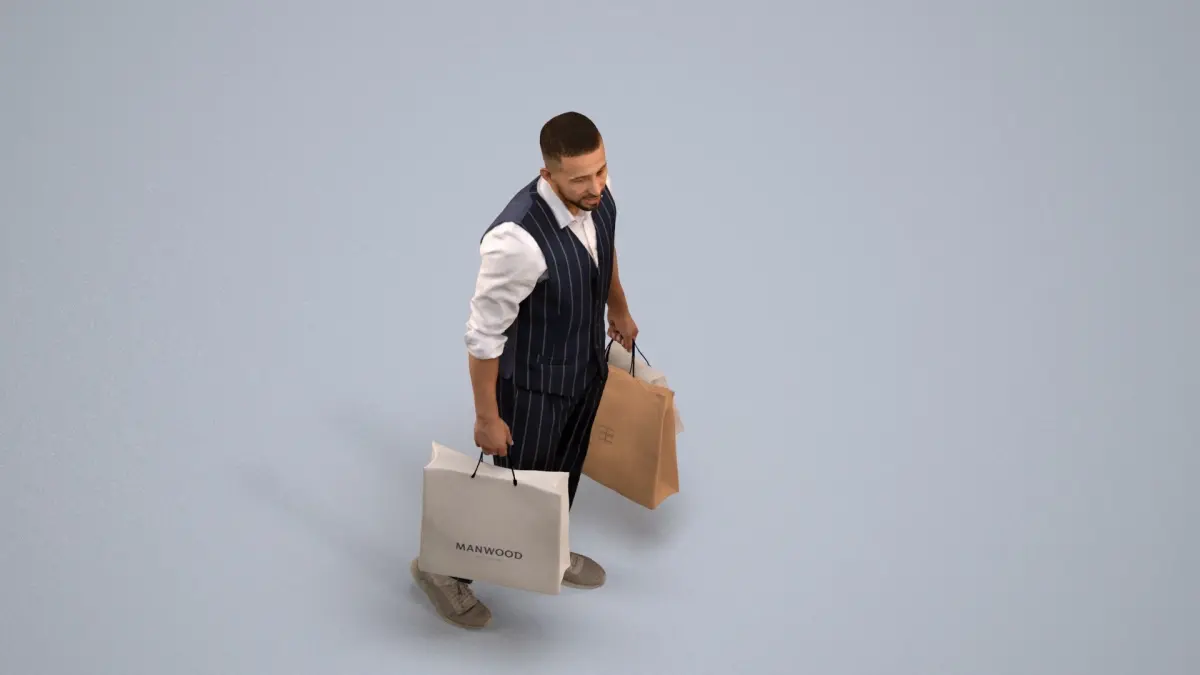 a man in a suit holding a shopping bag