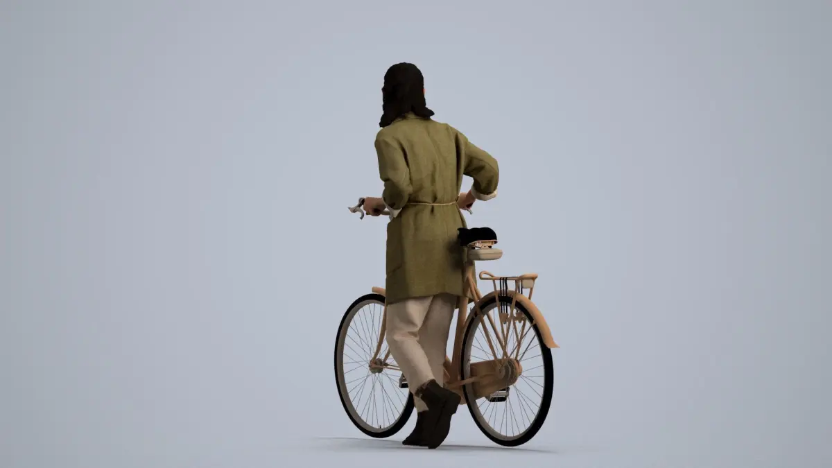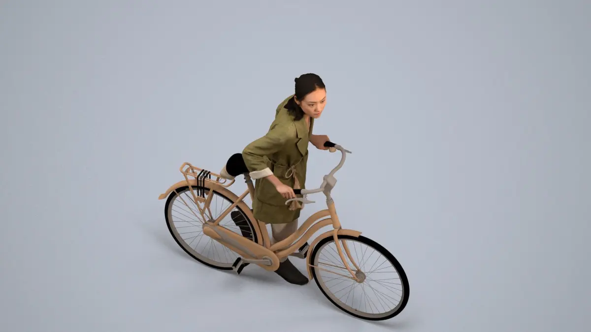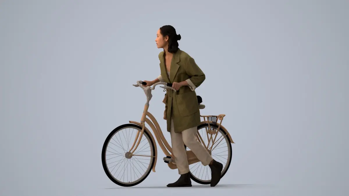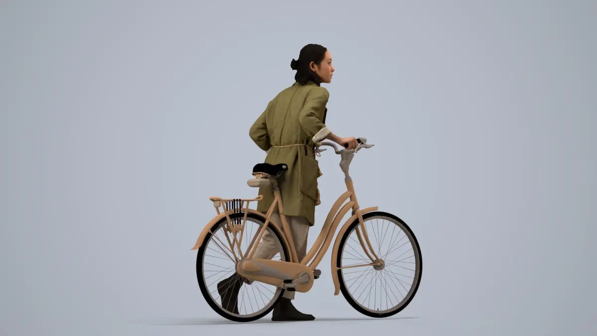 a woman in a green coat riding a bicycle