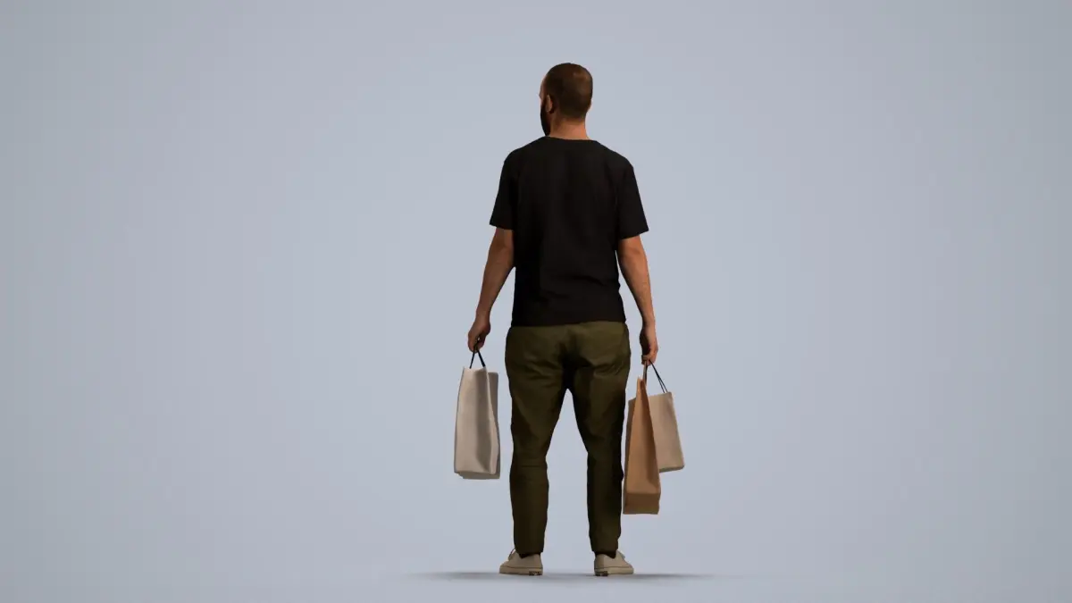 a man in a black t - shirt is holding two bags