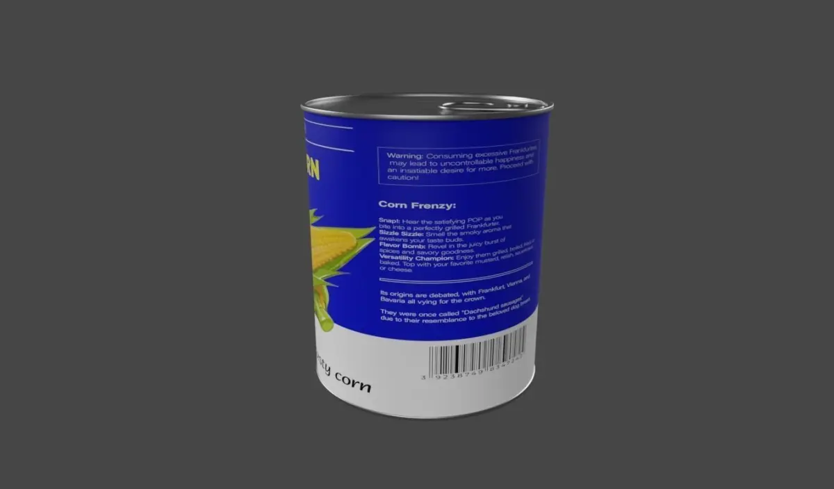 Highly detailed: From the wrinkled texture of the can to the individual plump kernels, this model delivers an unmatched level of realism.Multiple formats: Compatible with most major 3D software, so you can seamlessly integrate it into your workflow.PBR materials: Achieve stunningly realistic renderings with physically based materials that respond to light and environment like the real thing.Customizable: Adjust the label design, add condensation effects, or even animate the opening can (with the right software) for added dynamism.