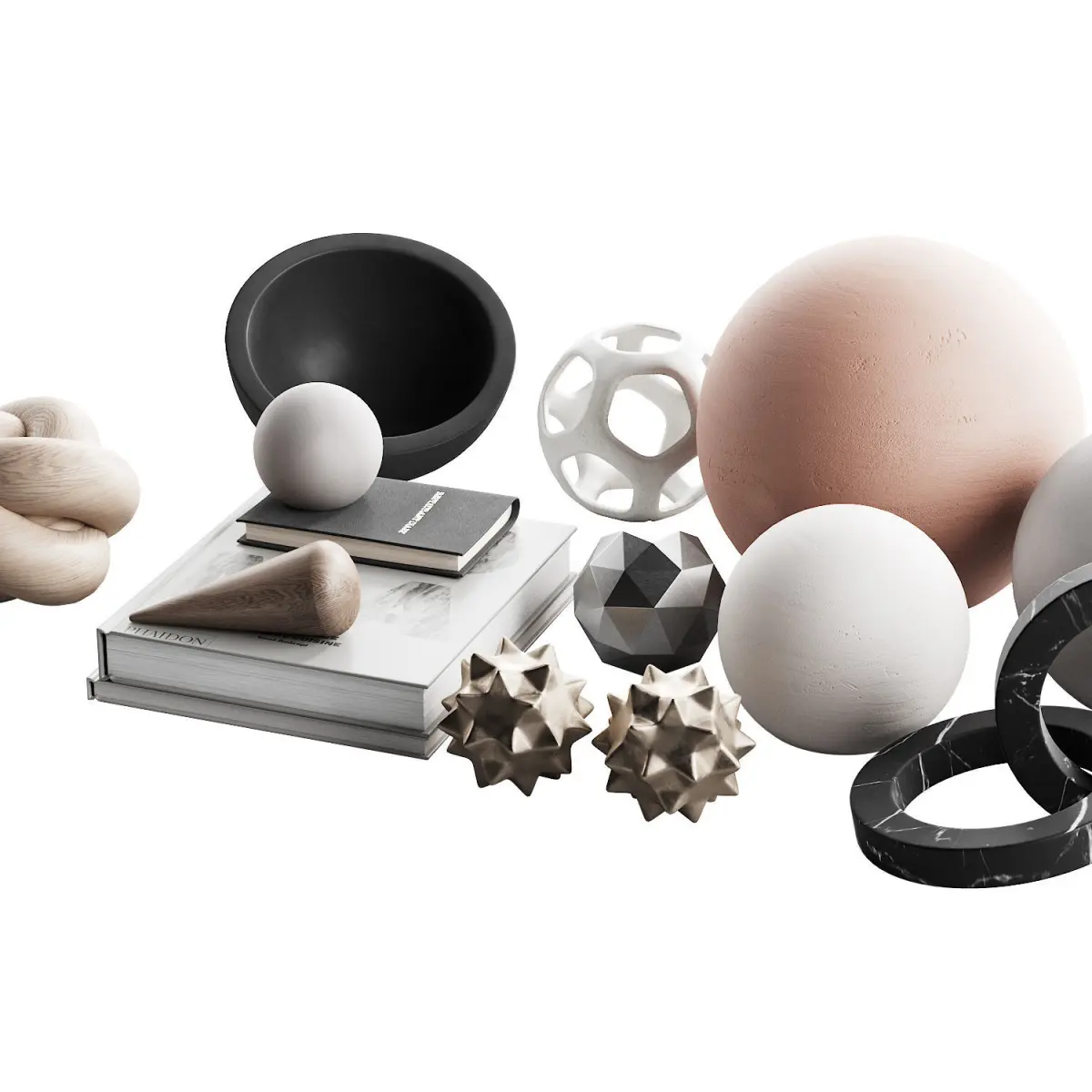 • Decorative items from the Desk Sculptures set by Kristina Dam. Materials: light walnut wood, polymer clay / ceramic in warm gray.(https://kristinadam.dk/products/desk-sculpture)