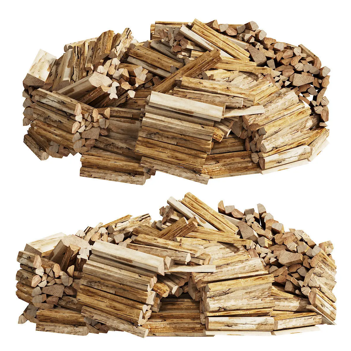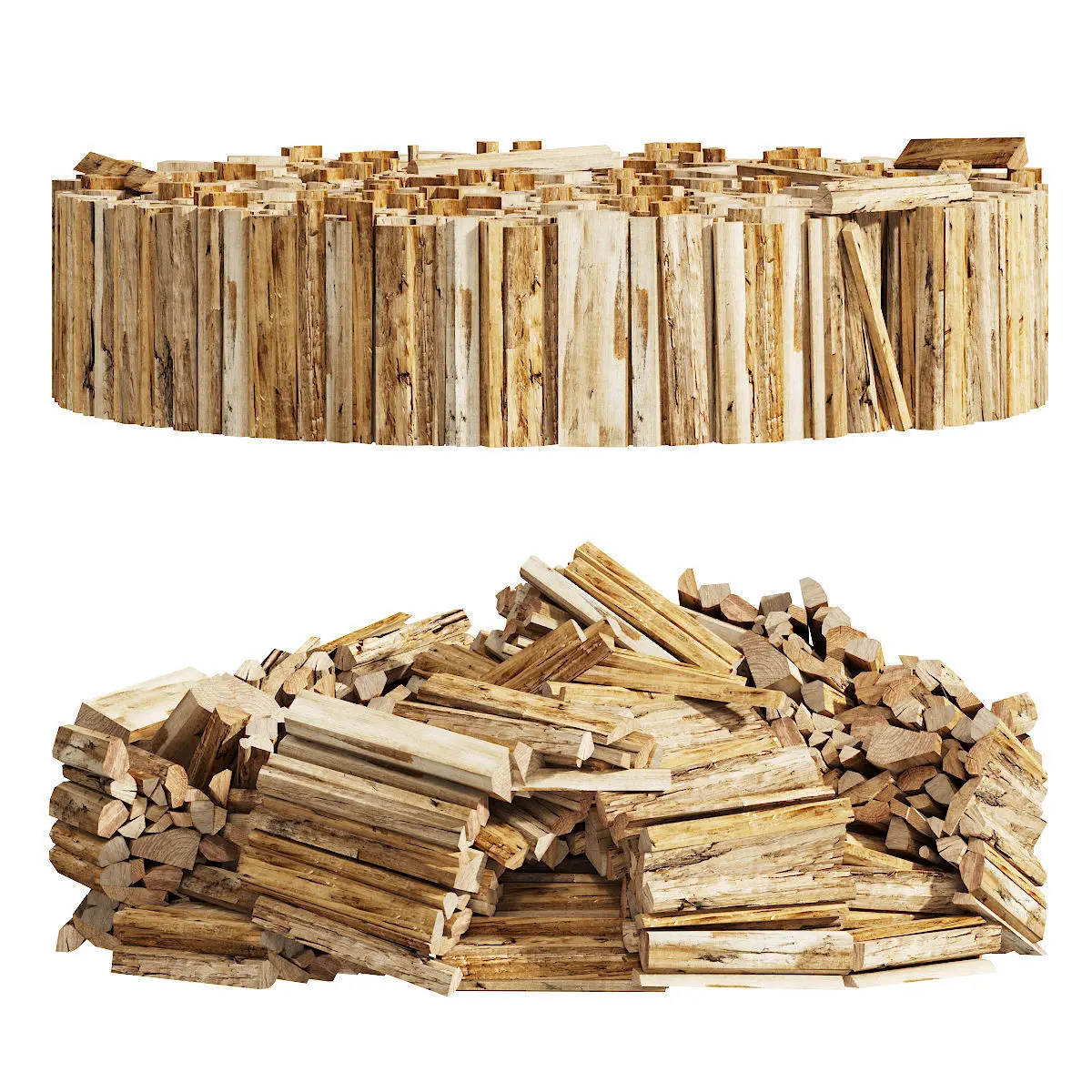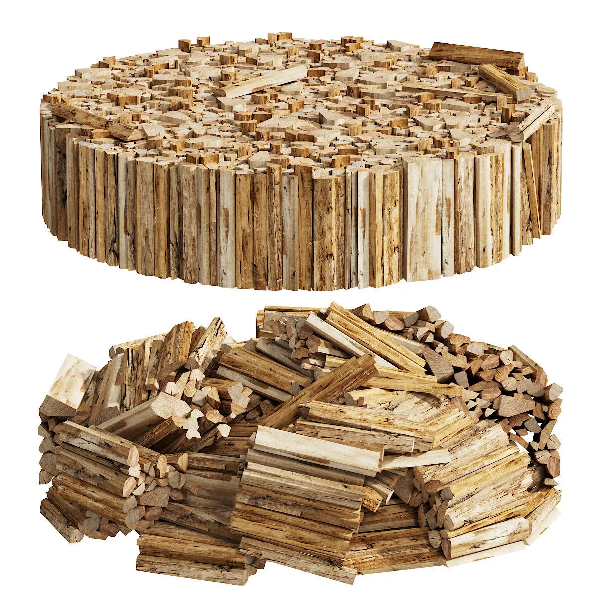 3d model of firewood laid out in 2 versions of round stacks. It can be suitable for bird angles or for decorating an exterior area.