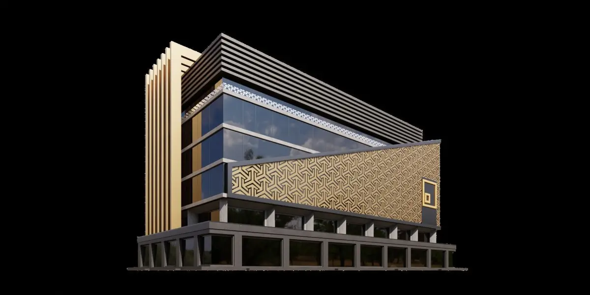 Modern building with a unique design. The building has a combination of brown and gold colors, giving it an elegant and sophisticated appearance. The structure is made up of multiple levels, with a prominent glass wall on the side. The building's facade is adorned with a pattern of squares, adding to its distinctive esthetic. The overall design of the building suggests a blend of traditional and contemporary architectural styles.