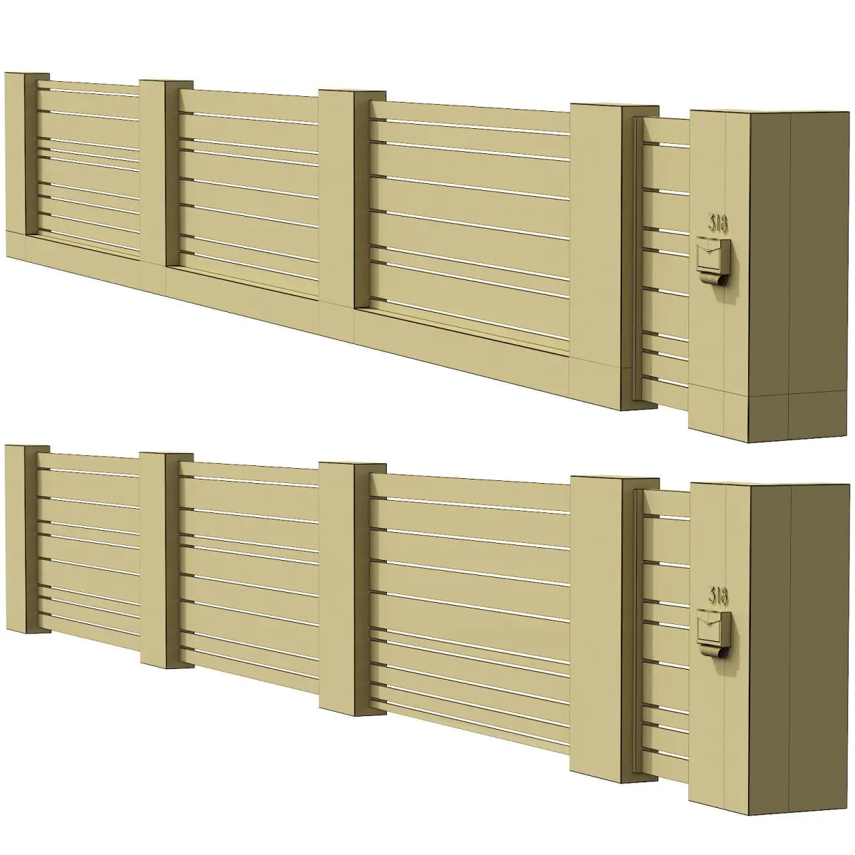 There are 2 types of fence in the scene - with a lower concrete lintel, and without it.