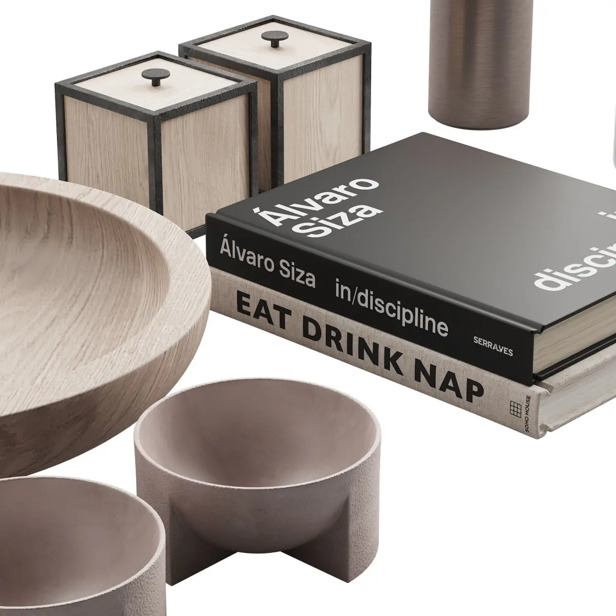 3d model of a decorative set for a coffee table, shelves, table, bedside tables or any other premises consists of: