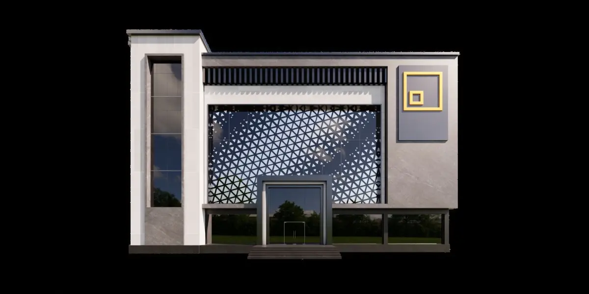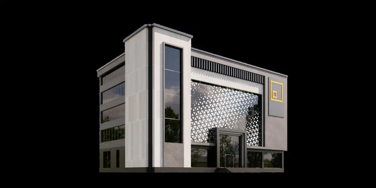 Modern building with a unique design.The building has a combination of gray and white colors, and it appears to be a multi-story structure.The facade of the building is adorned with a pattern of squares, giving it an interesting and visually appealing appearance.The building's windows are large and numerous, providing ample natural light to the interior.The overall design of the building suggests that it could be a commercial or office space.