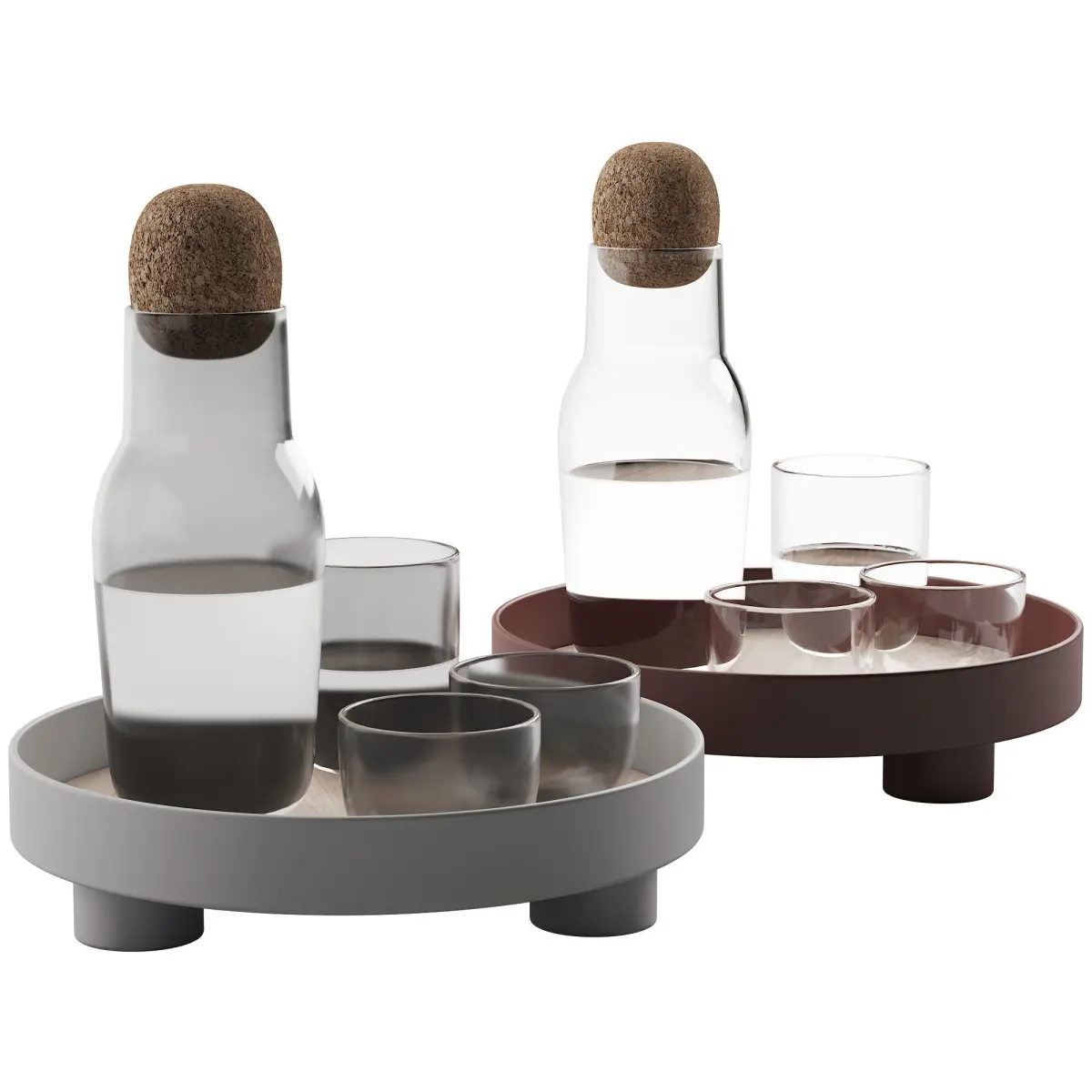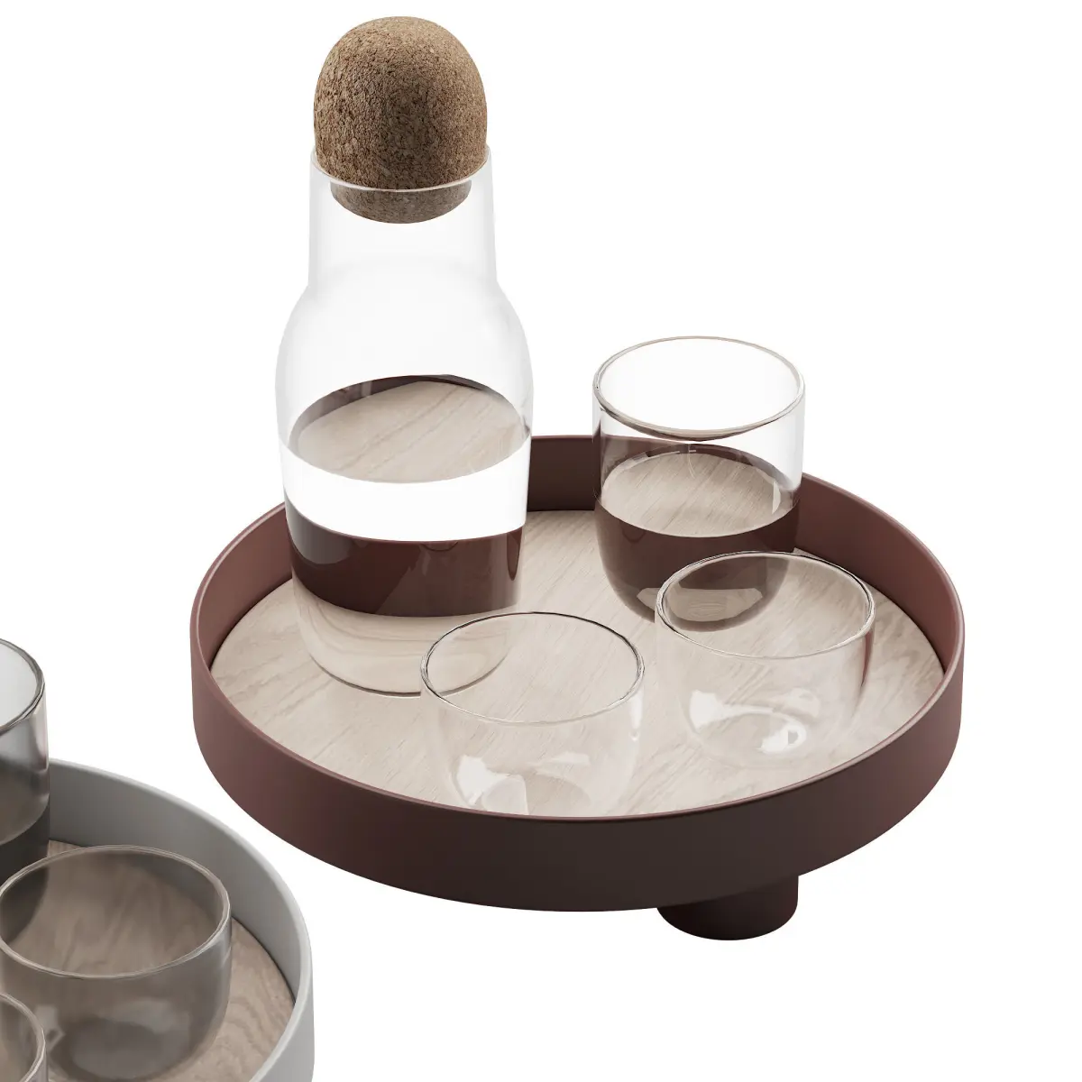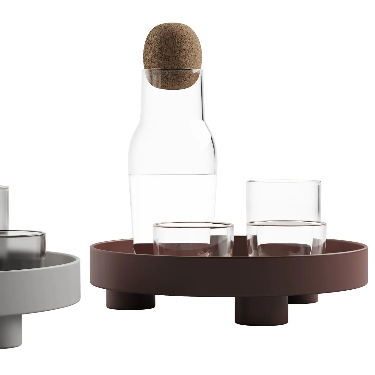 3d model of a decorative set of a jug and glasses on a tray for a coffee table, shelves, table, kitchen, dining area, bedside tables or any other premises. Suitable as a decorative set for a table in a cafe or restaurant.
