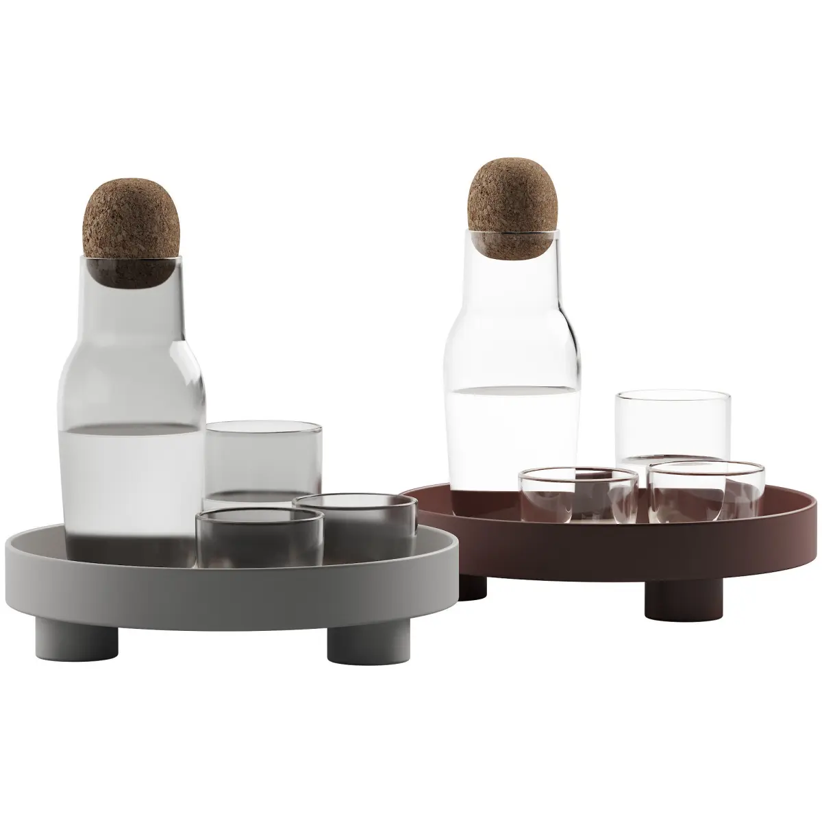 • Jug bottle muuto CORKY CARAFE filled with water. Material: gray glass and clear glass(https://www.muuto.com/product/Corky-Carafe--p1911/p1911/)