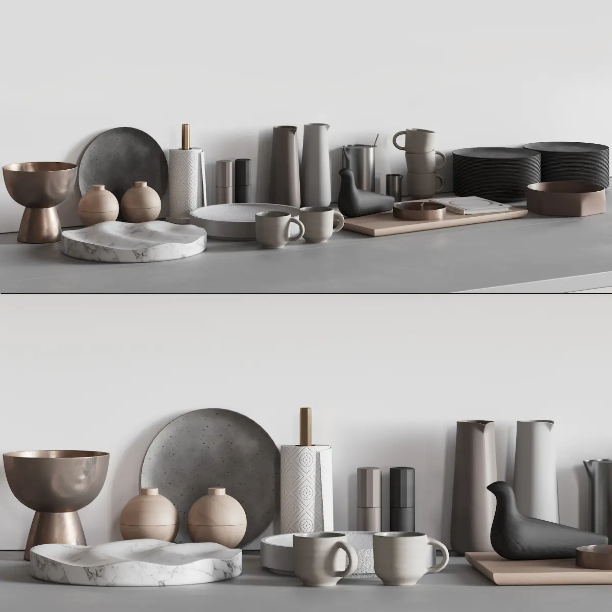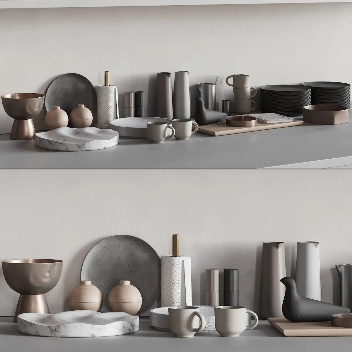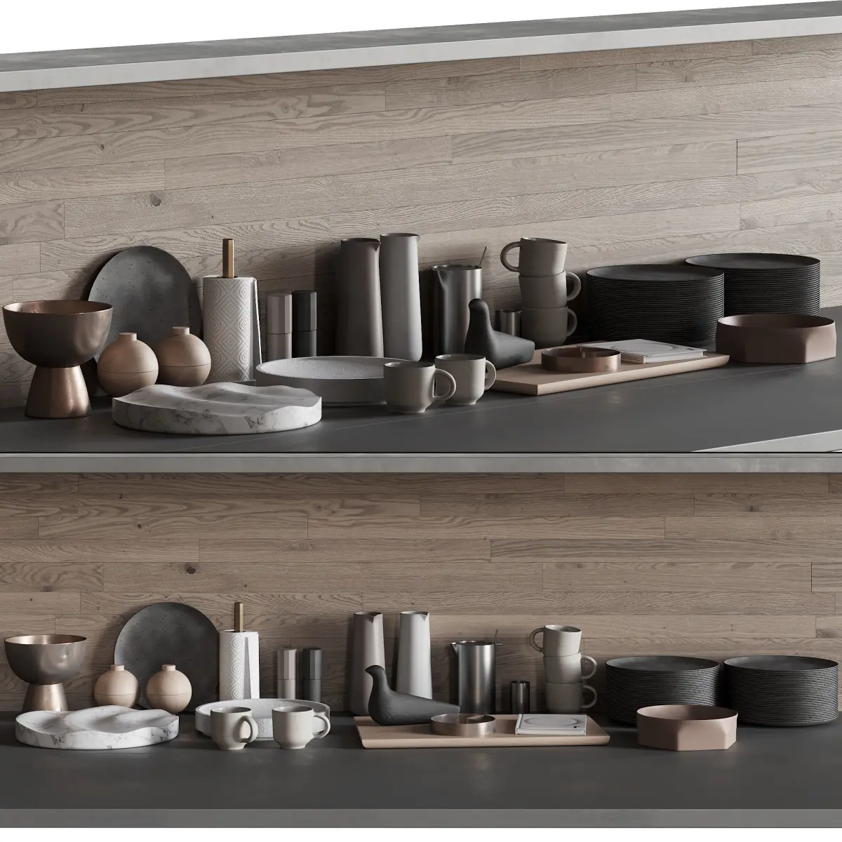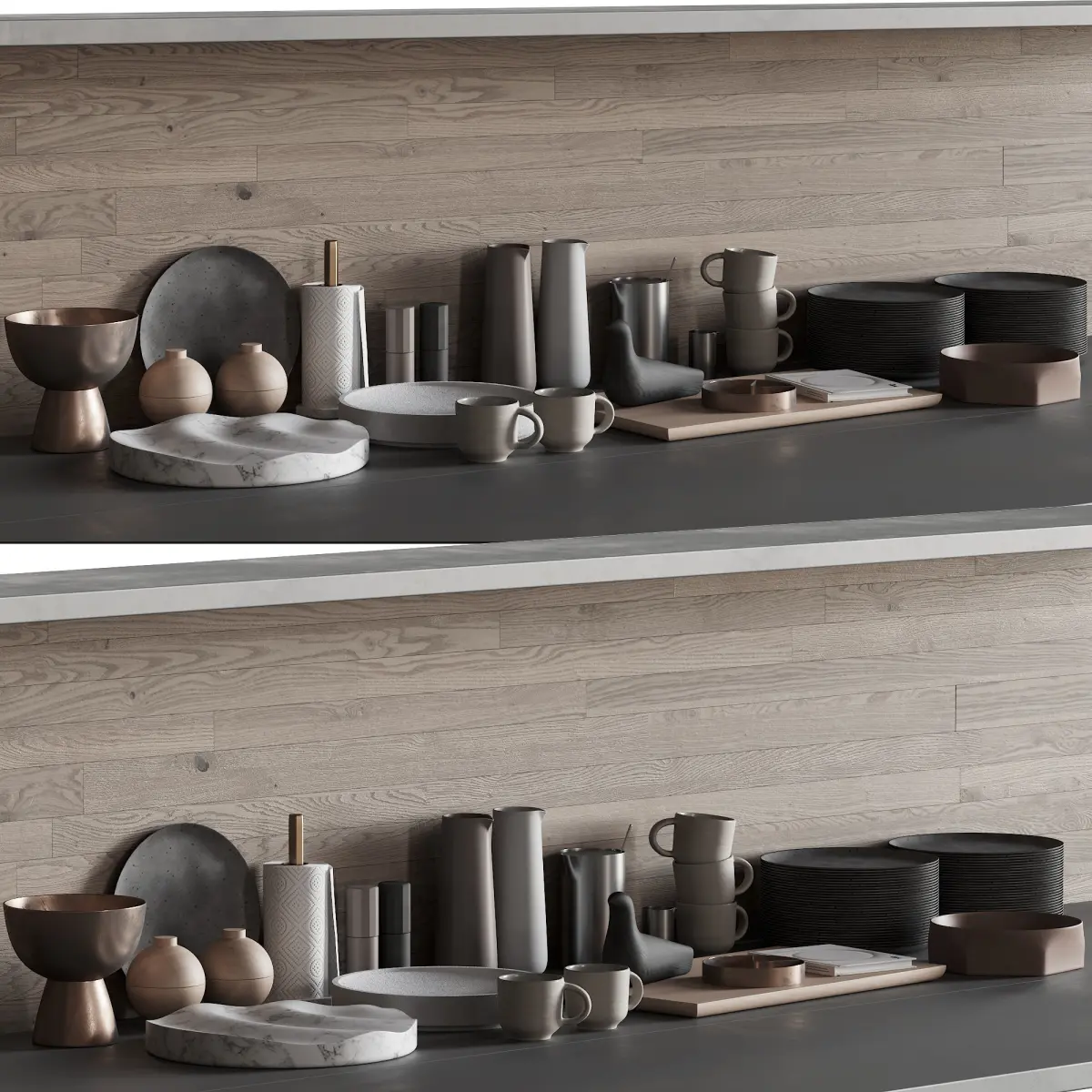 3d model of a decorative set of dishes and kitchen accessories. Suitable for placement on shelves, tables, bar counters, kitchen cabinets, etc.